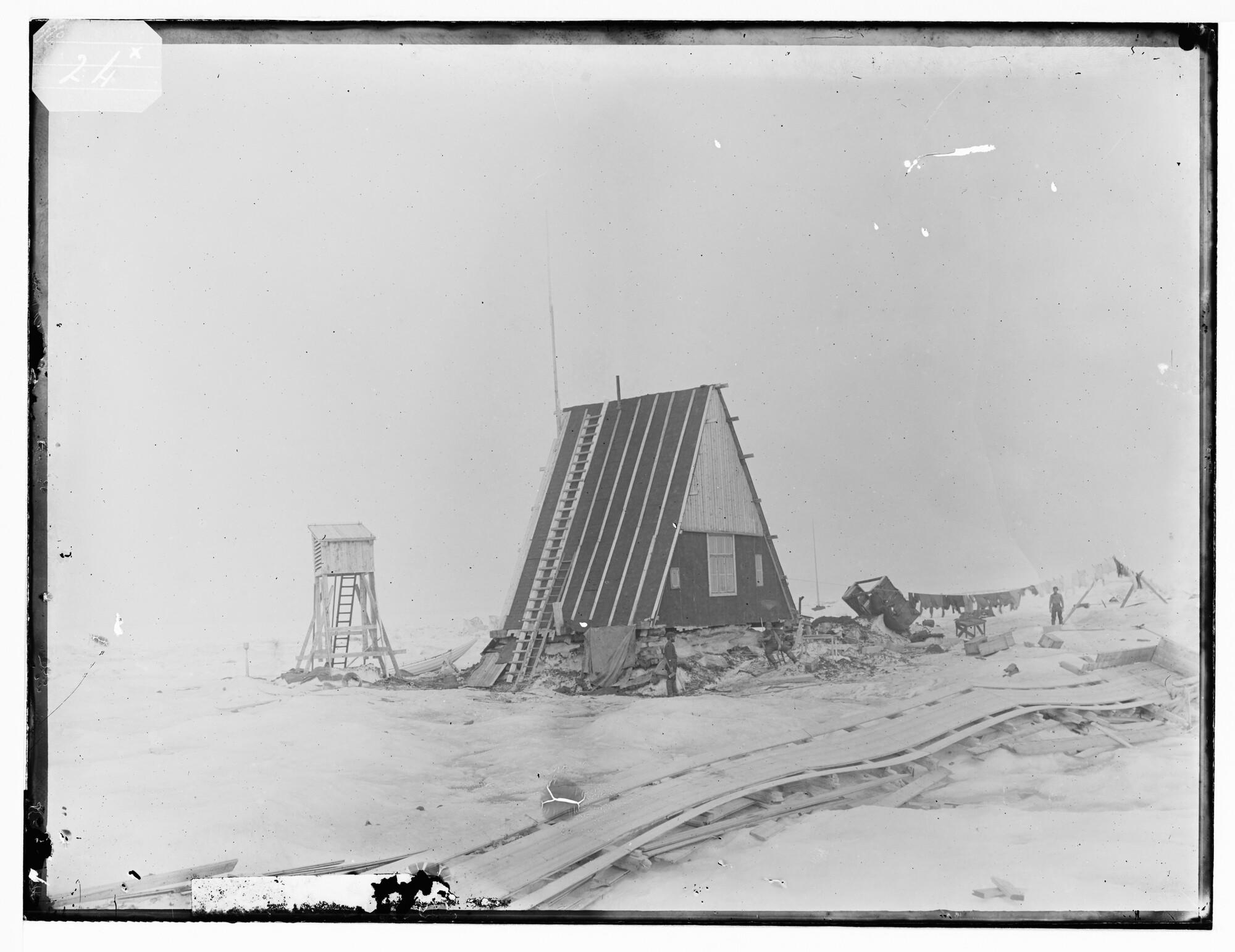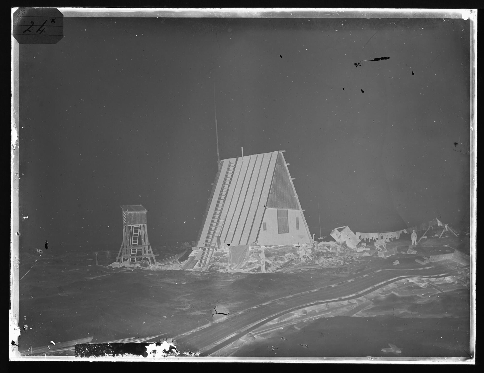 Glasnegatief van het het huis op ijsschots Nieuw Holland in de Karazee vanuit het zuidzuidwesten gezien op 9 juli 1883. Aan de stutten onder het huis is goed te zien hoe zeer het ijs gesmolten was. Voor het huis zijn twee expeditieleden aan het werk, naast het huis poseert een derde voor de waslijn. Op ...