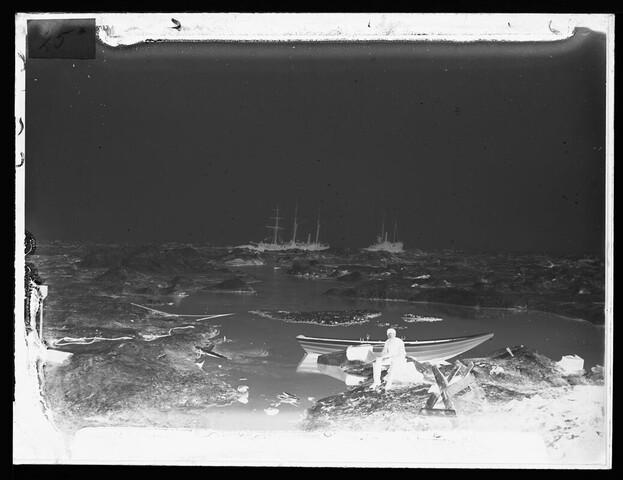 Glasnegatief van het uitzicht van de kamer van de expeditieleider Maurits Snellen aan de noordzijde van het huis op ijsschots Nieuw Holland in de Karazee op 9 juli 1883. Op de achtergrond de schepen Dijmphna en Varna, 13 dagen voordat de Varna ten onder zou gaan. De persoon op de voorgrond is vermoedelijk een van ...