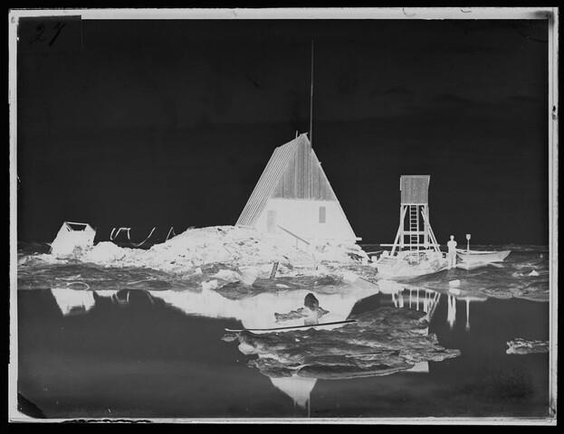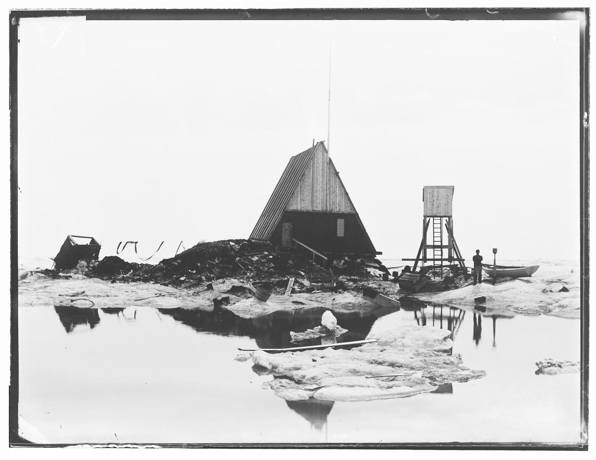 Glasnegatief van het huis op ijsschots Nieuw Holland in de Karazee vanuit het noordnoordwesten gezien op 13 juli 1883. Het water en de stutten onder het huis laten goed zien hoe zeer het ijs gesmolten was. Voor de thermometerhut poseert een bemanningslid.