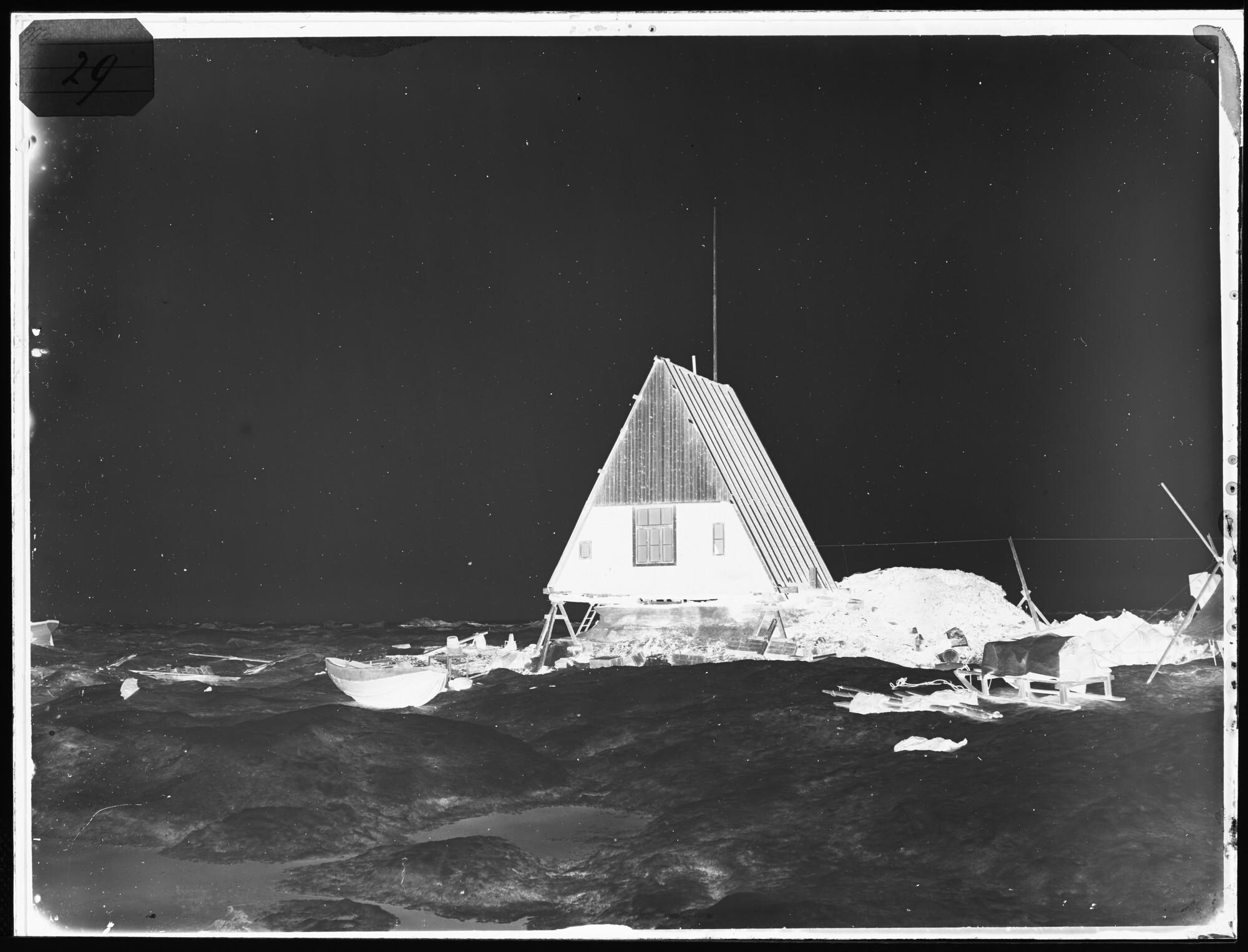 Glasnegatief van het huis op ijsschots Nieuw Holland op de dag voor het vertrek van de expeditieleden en de Noorse bemanning van de Varnaop 31 juli 1883. De voorbedeidingen worden getroffen en de sloepen en sleden in gereedheid gebracht. Rechts is een opgestelde camera te zien, vermoedelijk van de botanist/medicus en fotograaf van de Dijmphna-expeditie, ...