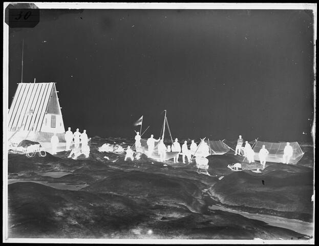 Glasnegatief van de Nederlandse expeditieleden, de Noorse bemanning van de Varna en de gehele uitrusting op de dag voordat de gecombineerde sledetocht begon, 31 juli 1883. De sloepen met daarover gespannen tenten waren ingericht als nachtverblijf. De andere open en opgetuigd om onder zeil te gaan. Bij elke sloep een slede met proviand en andere ...