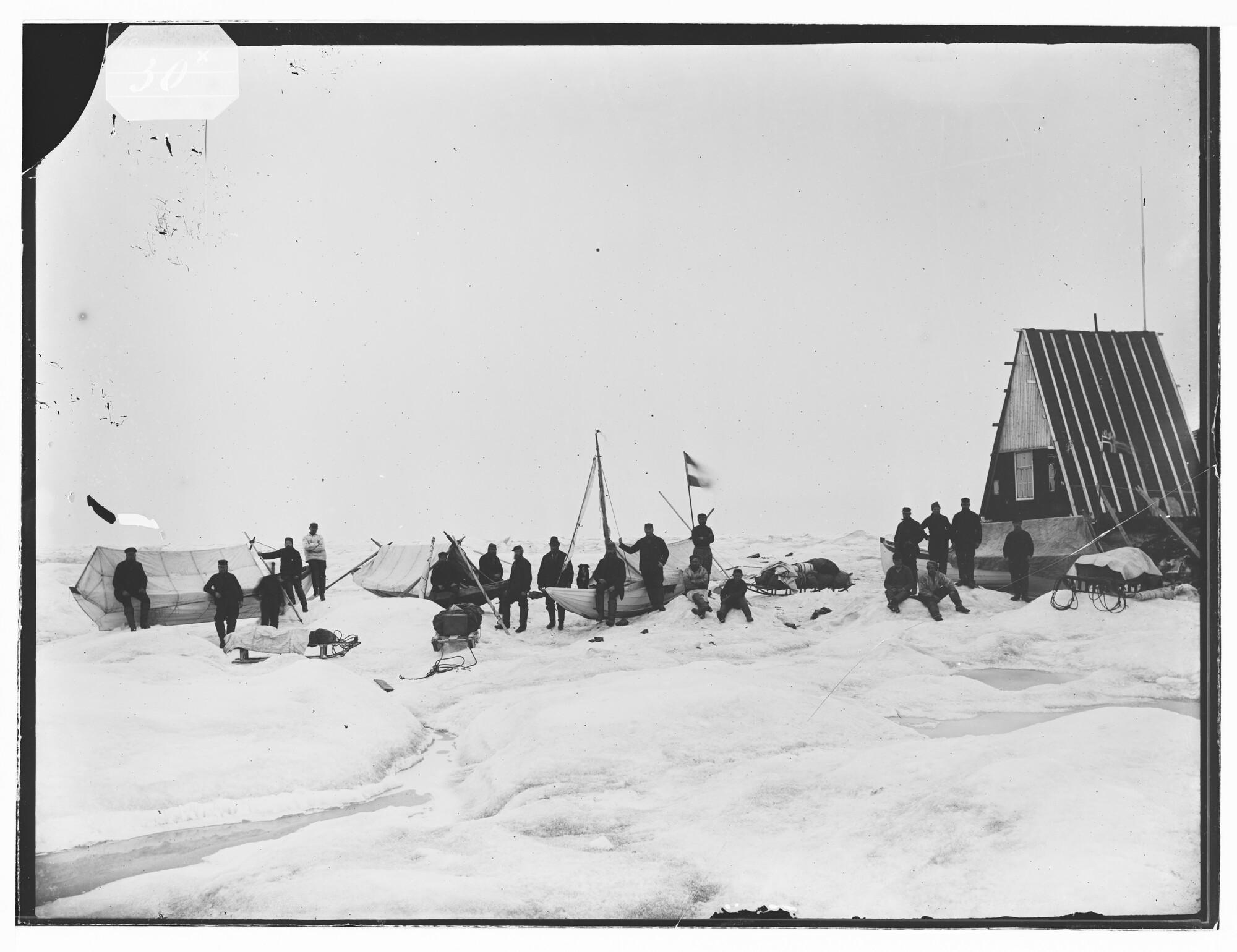 Glasnegatief van de Nederlandse expeditieleden, de Noorse bemanning van de Varna en de gehele uitrusting op de dag voordat de gecombineerde sledetocht begon, 31 juli 1883. De sloepen met daarover gespannen tenten waren ingericht als nachtverblijf. De andere open en opgetuigd om onder zeil te gaan. Bij elke sloep een slede met proviand en andere ...