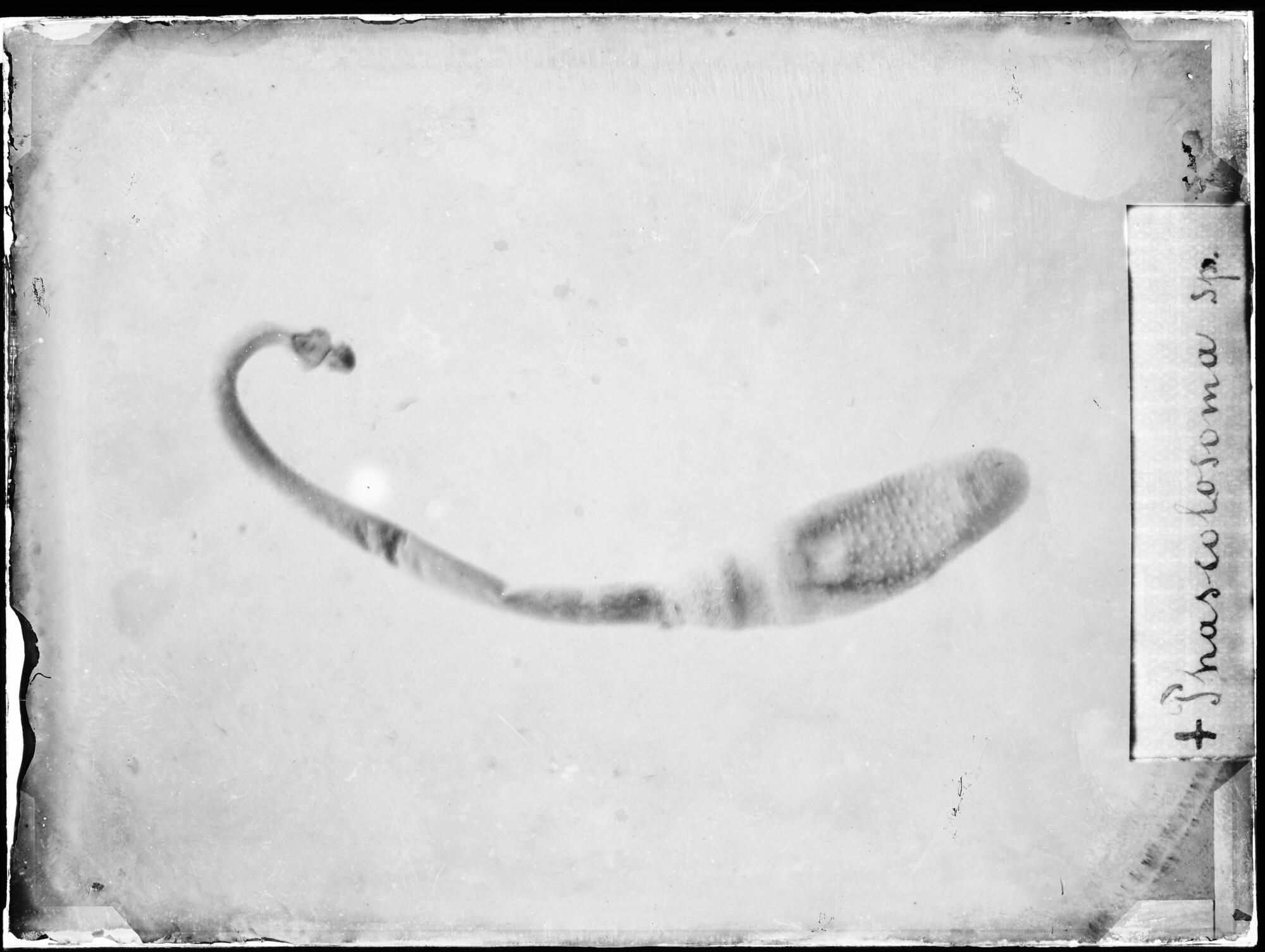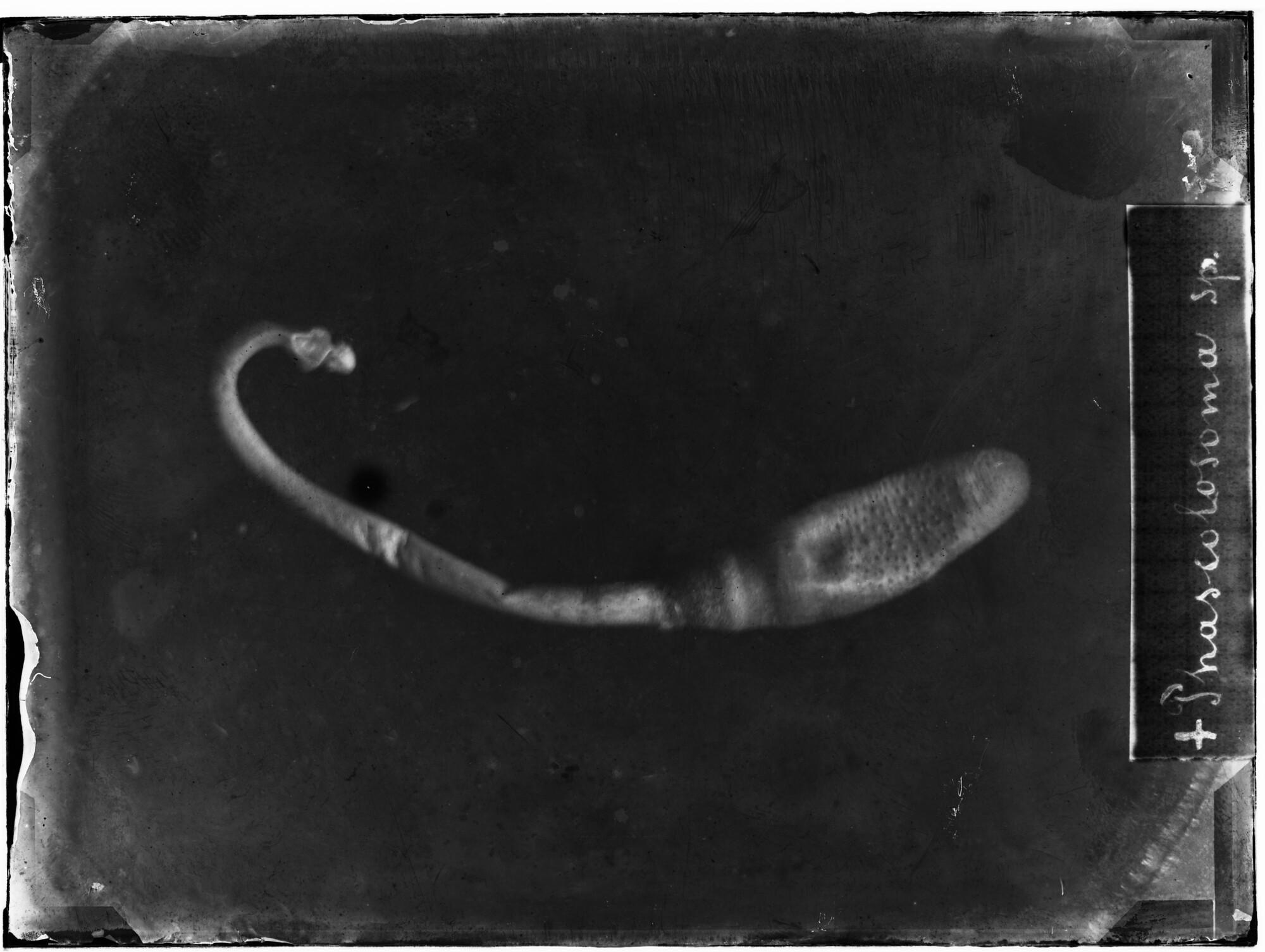 Glasnegatief van een Phascolosoma (Phascolosoma) nigrescens, een pindawormsoort uit de familie Phascolosomatidae, in de Karazee gevangen door Johannes Marinus Ruijs tijdens de Nederlandse Poolexpeditie van 1882 - 1883.