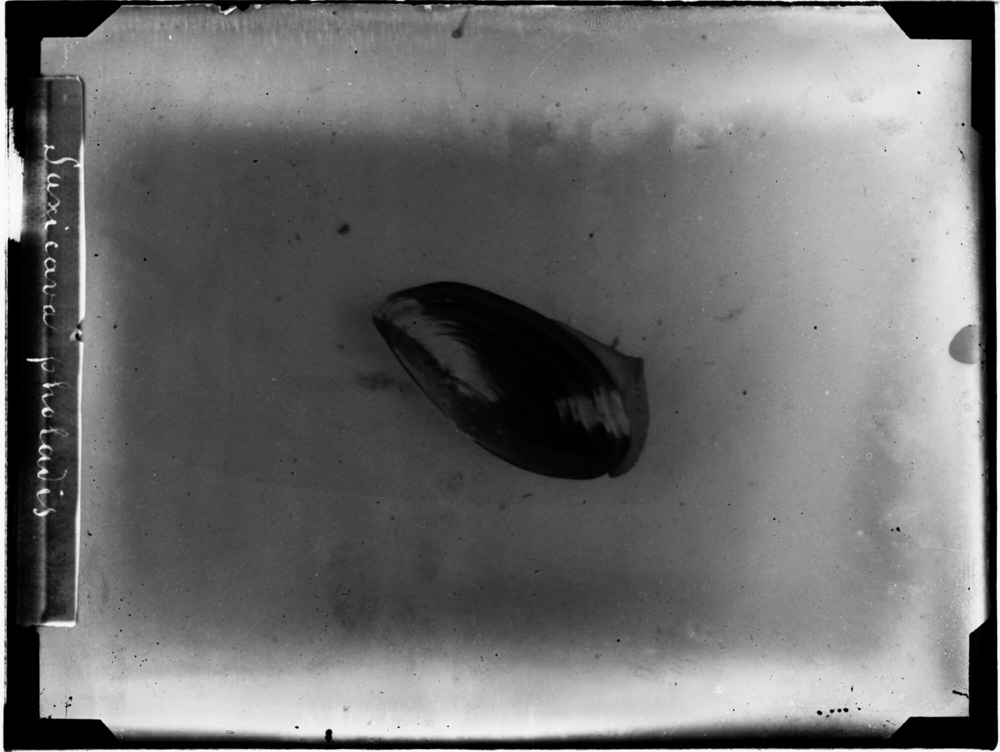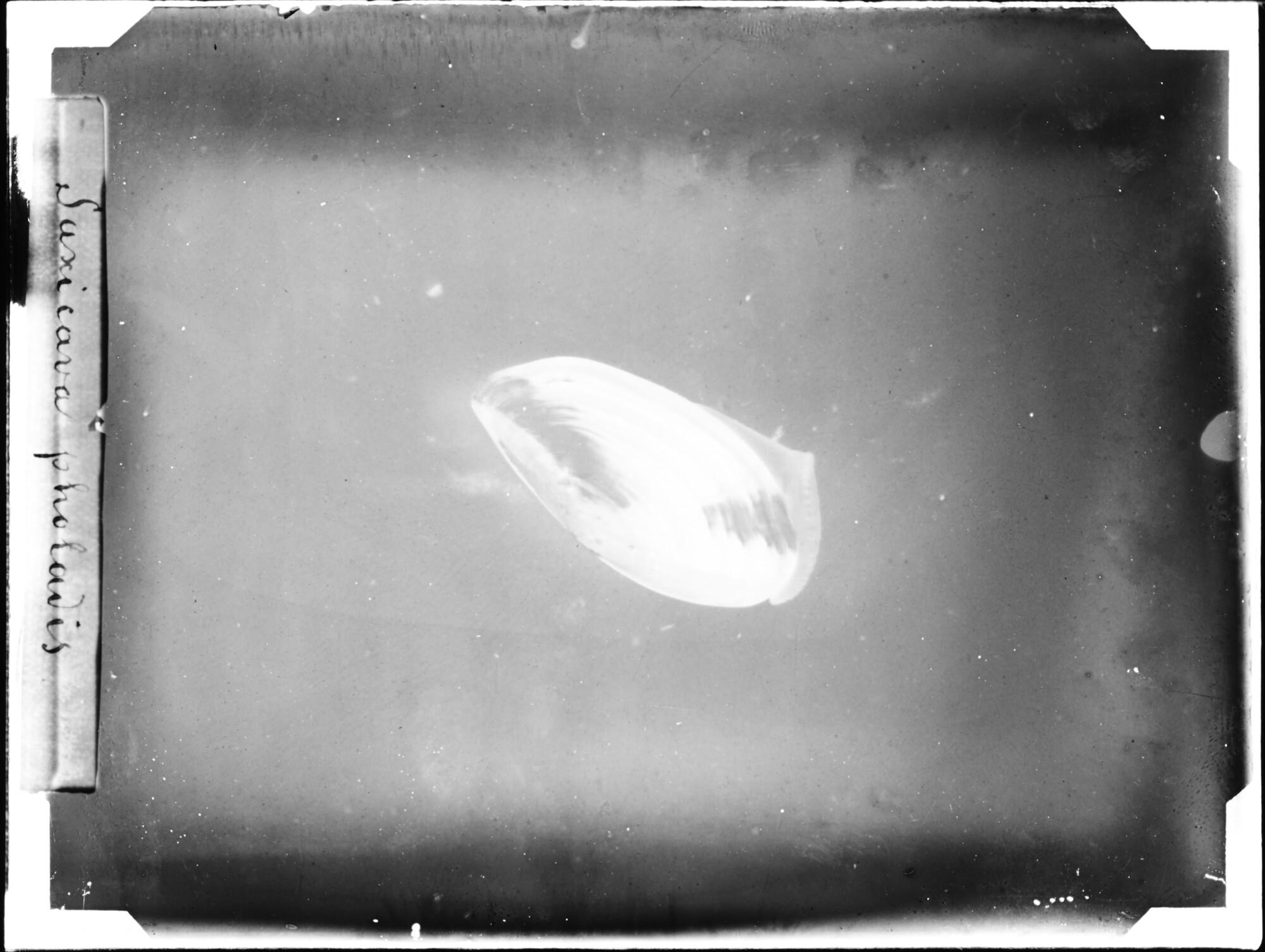 Glasnegatief van een Noordse rotsboorder (Hiatella arctica), een tweekleppigensoort uit de familie Hiatellidae, in de Karazee gevangen door Johannes Marinus Ruijs tijdens de Nederlandse Poolexpeditie van 1882 - 1883.