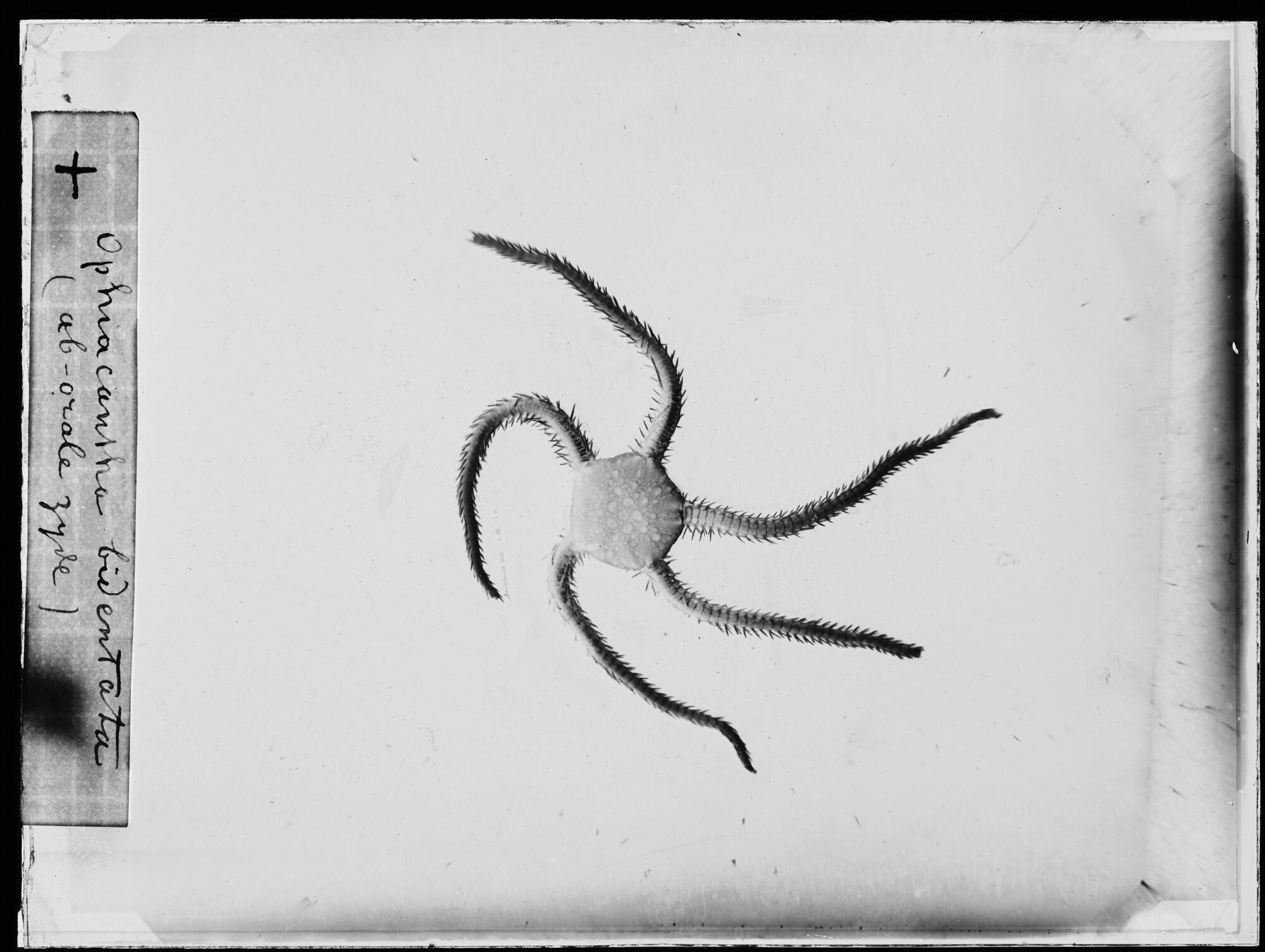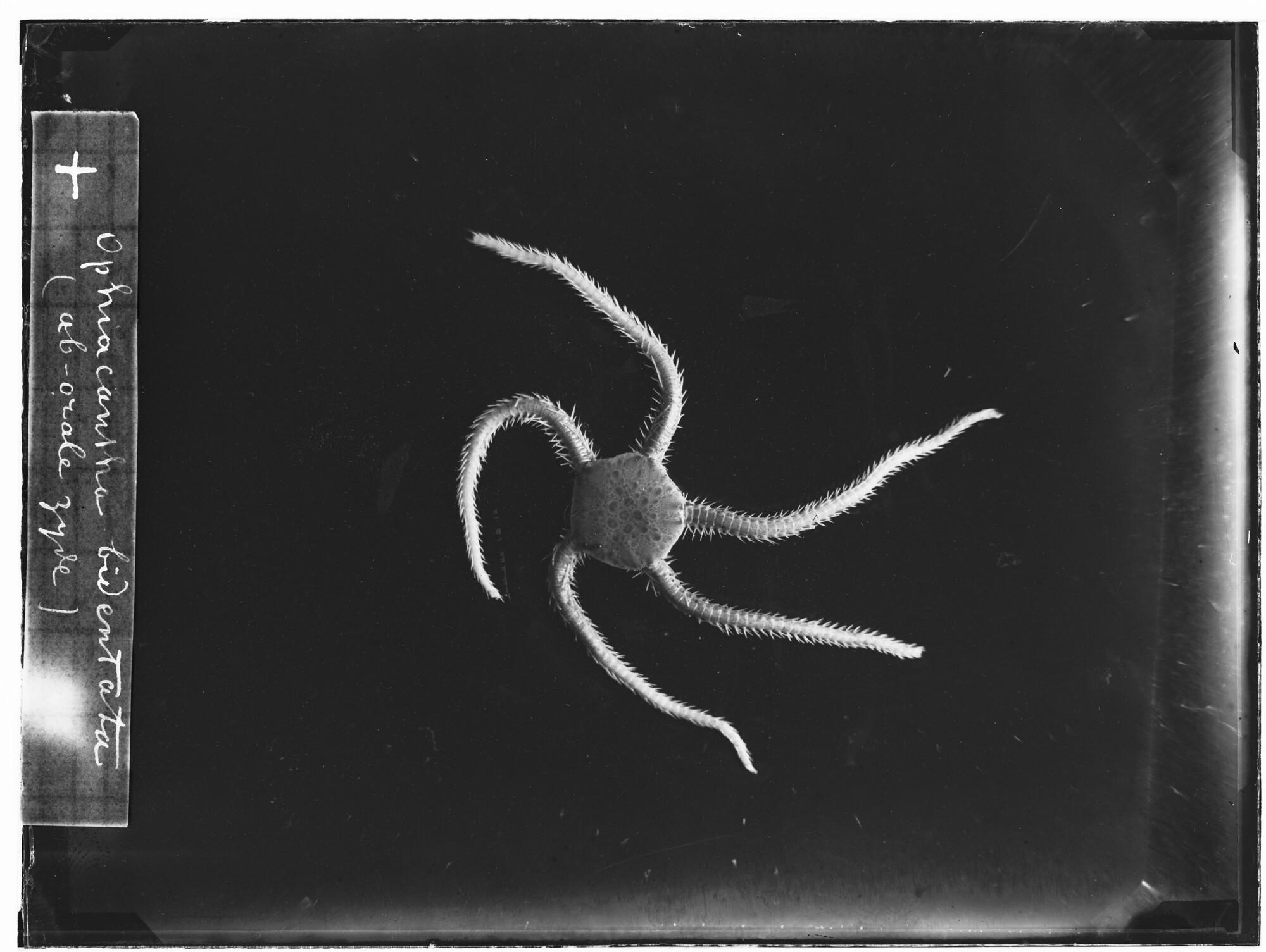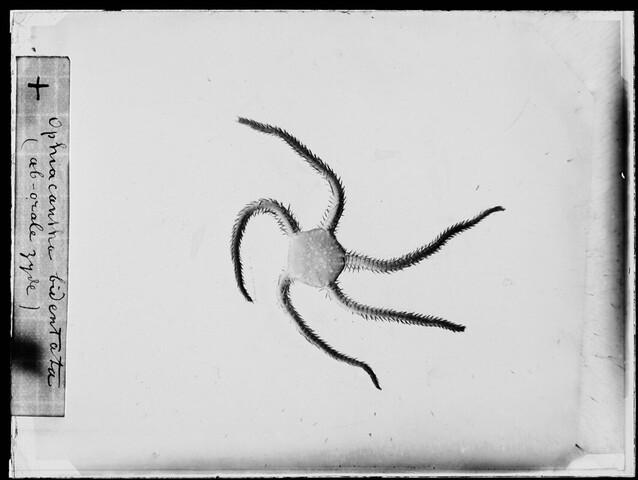 Glasnegatief van een Ophiacantha bidentata, een slangster uit de familie Ophiacanthidae, in de Karazee gevangen door Johannes Marinus Ruijs tijdens de Nederlandse Poolexpeditie van 1882 - 1883.