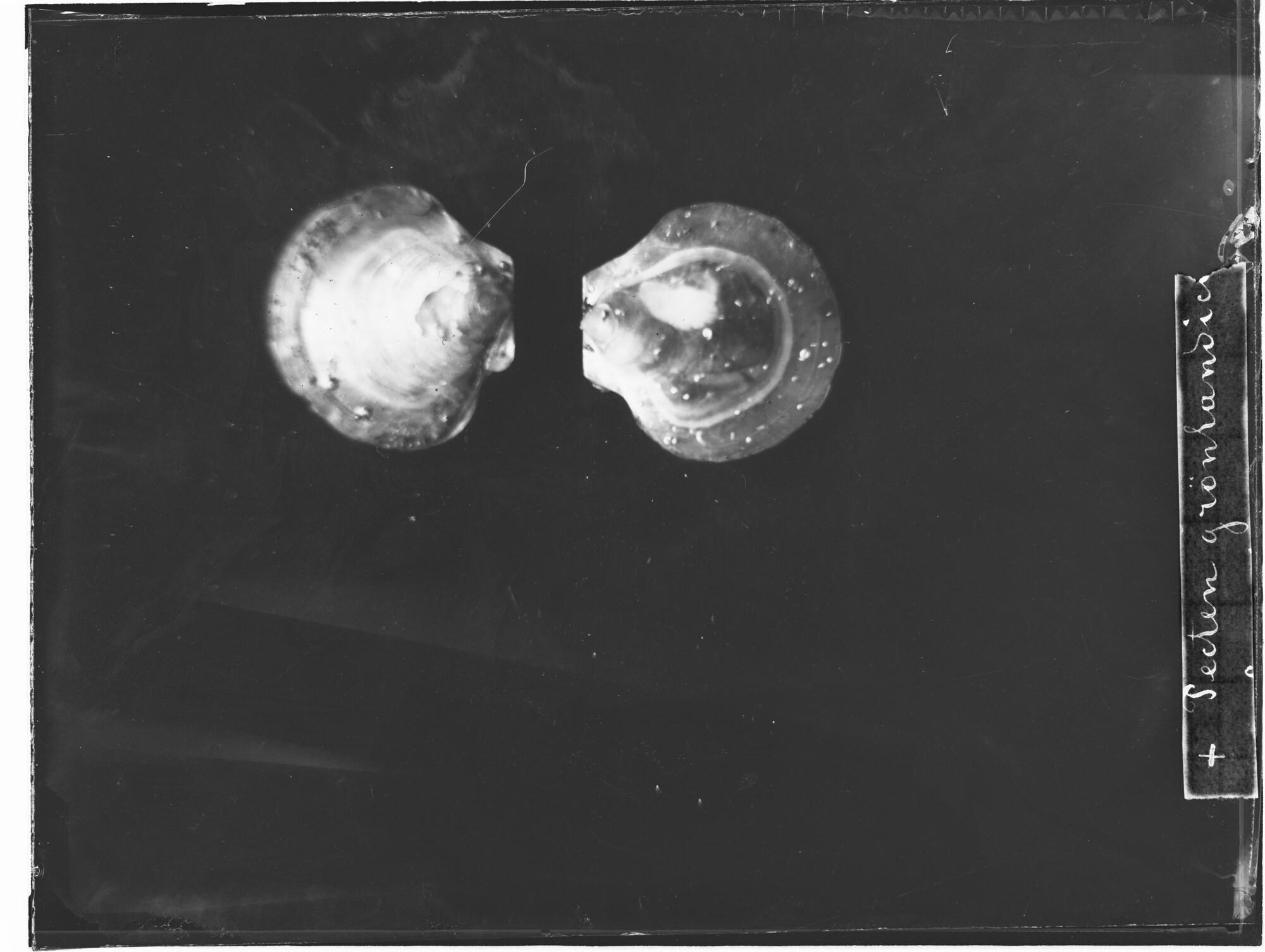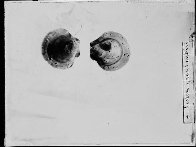 Glasnegatief van een Similipecten greenlandicus, een tweekleppigensoort uit de familie van de Propeamussiidae, in de Karazee gevangen door Johannes Marinus Ruijs tijdens de Nederlandse Poolexpeditie van 1882 - 1883.