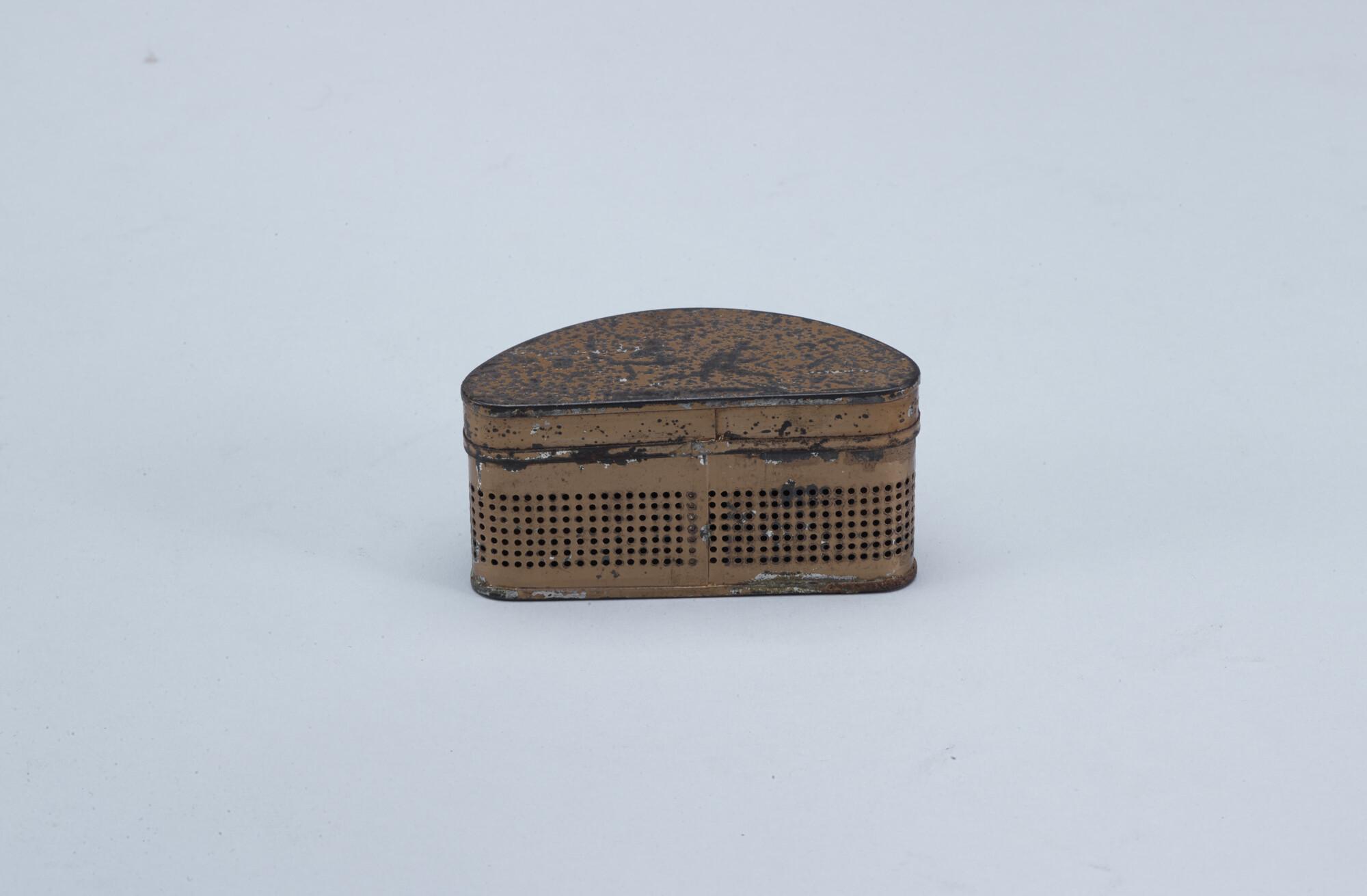 Longbeschermer, Lungenschutzer-respirator, in metalen doosje met het etiket van de verpakking. Onderdeel uit de medicijnkist van de Nederlandse Noordpool Expeditie 1882 - 1883.