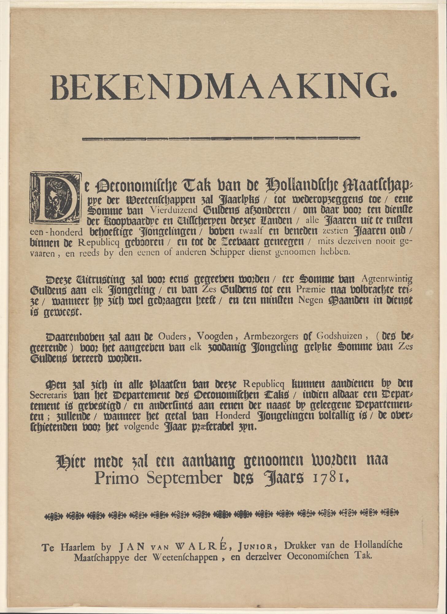 Bekendmaaking. De Oeconomische Tak van de Hollandsche Maatschappije der Weetenschappen zal jaarlyks [...] eene Somme van Vierduizend Guldens afzonderen [...]