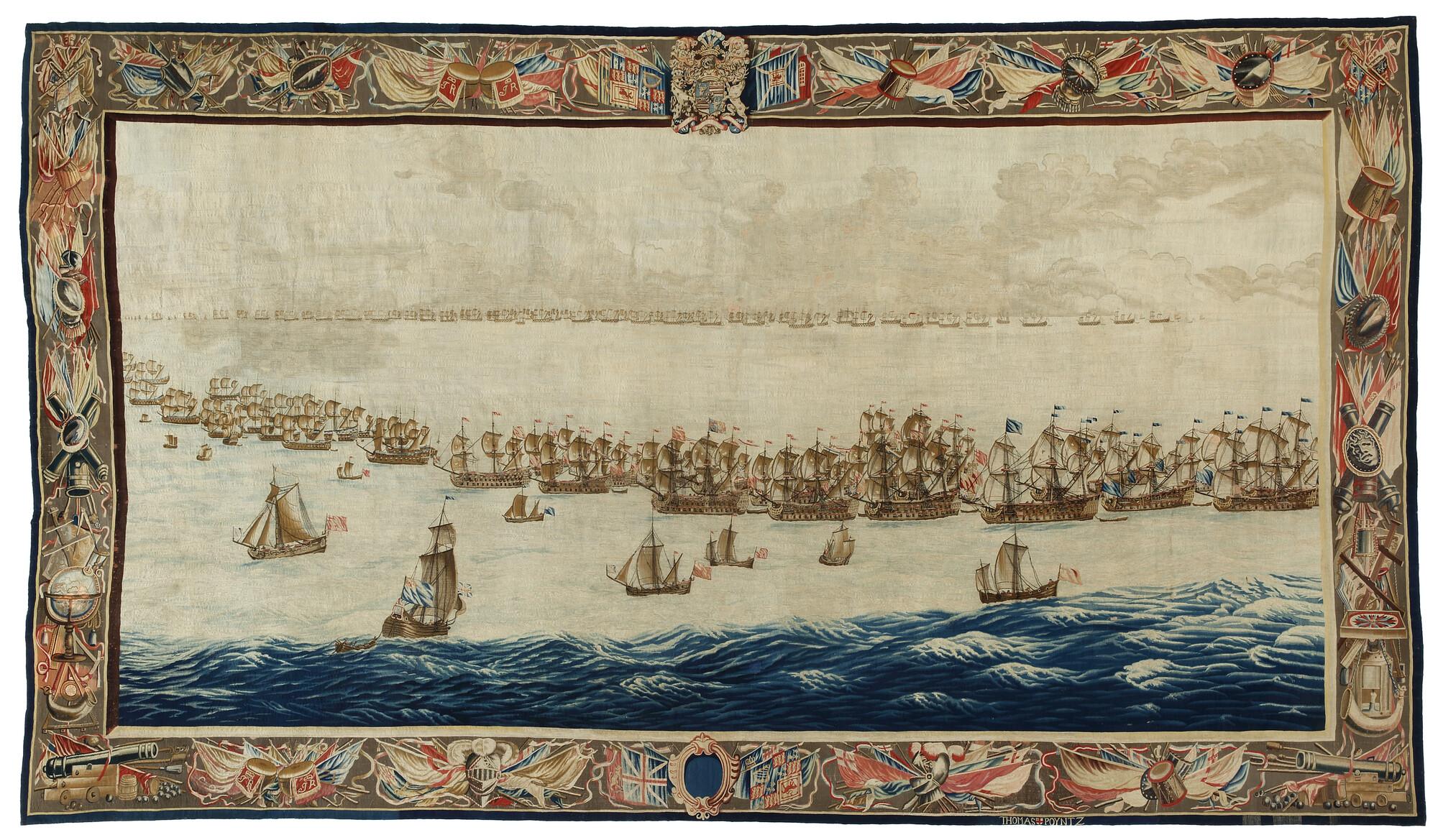 Tapisserie of wandtapijt met een voorstelling van de Slag bij Solebay waarop beide vloten zich in linie opstellen, klaar voor het gevecht op de tweede dag (8 juni 1672). Op de voorgrond liggen de schepen van het witte, rode en blauwe eskader van de gezamenlijke Engels-Franse vloot, aan de horizon ligt de Nederlandse vloot onder ...