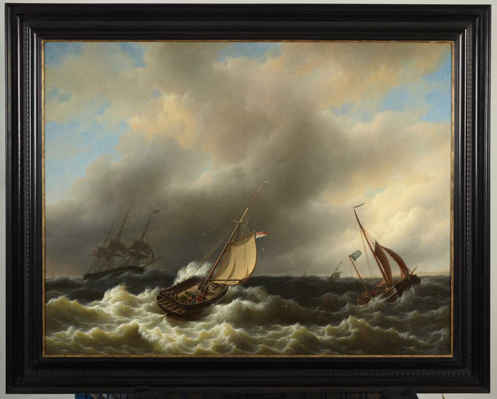 Schilderij van een kotter en een loodsrinkelaar op een ruwe zee. In lijst.