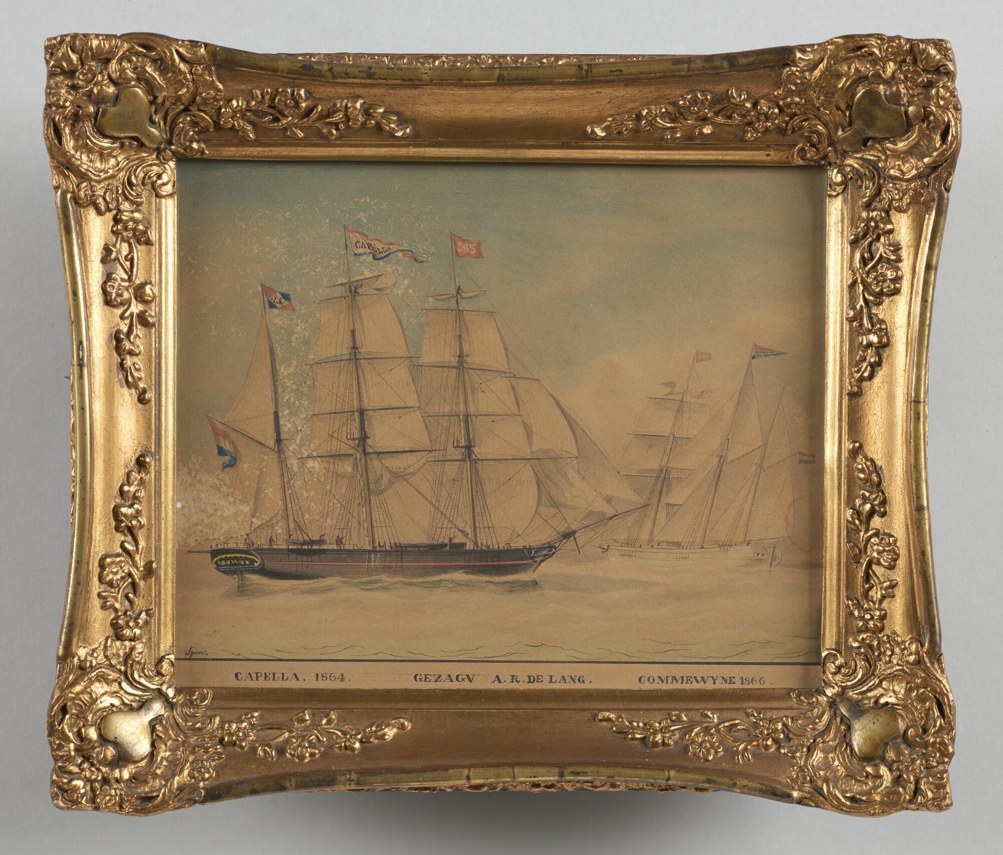 Aquareltekening van barkschip Capella (1864) onder gezag van A.R. de Lang, met op de achtergrond het barkschip Commewijne (1866). In lijst.