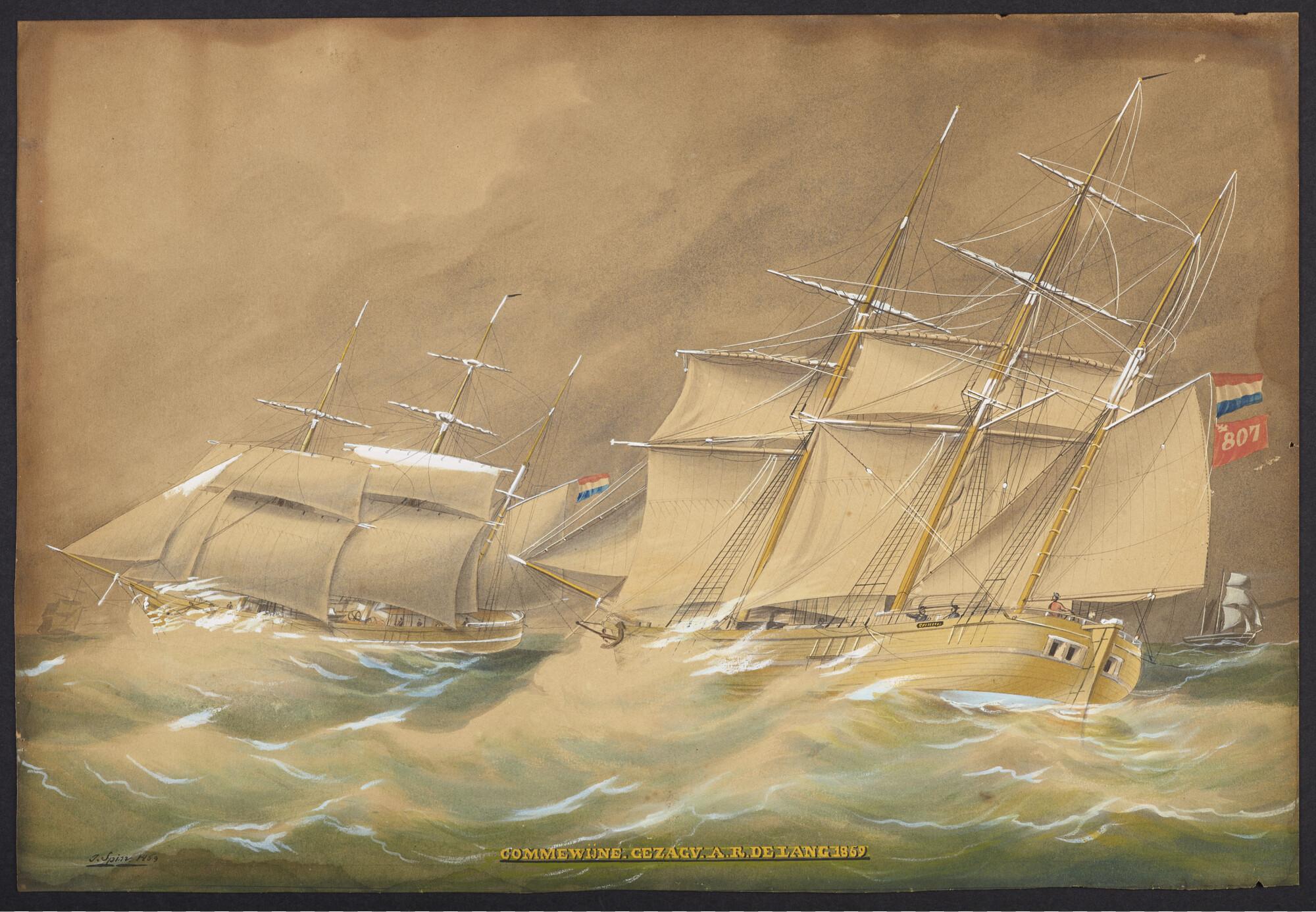 Het barkschip Commewijne met volle zeilen. In lijst.