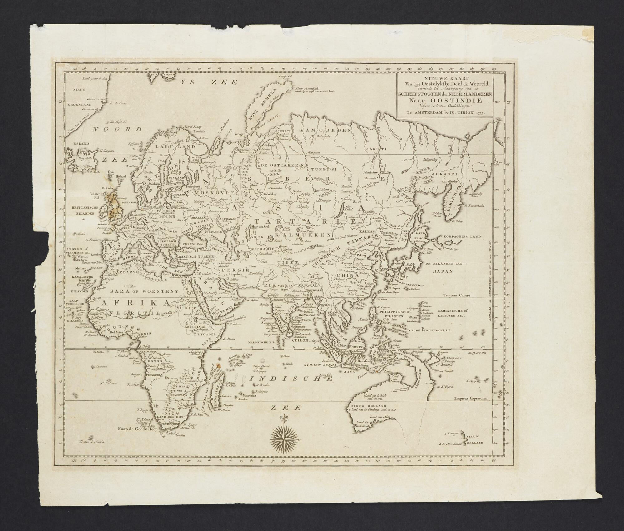 Kaart van het oostelijk deel van de wereld ten dienste van de vaart op Oost-Indië, in 1753 uitgegeven door Isaak Tirion (1705-1765) te Amsterdam.