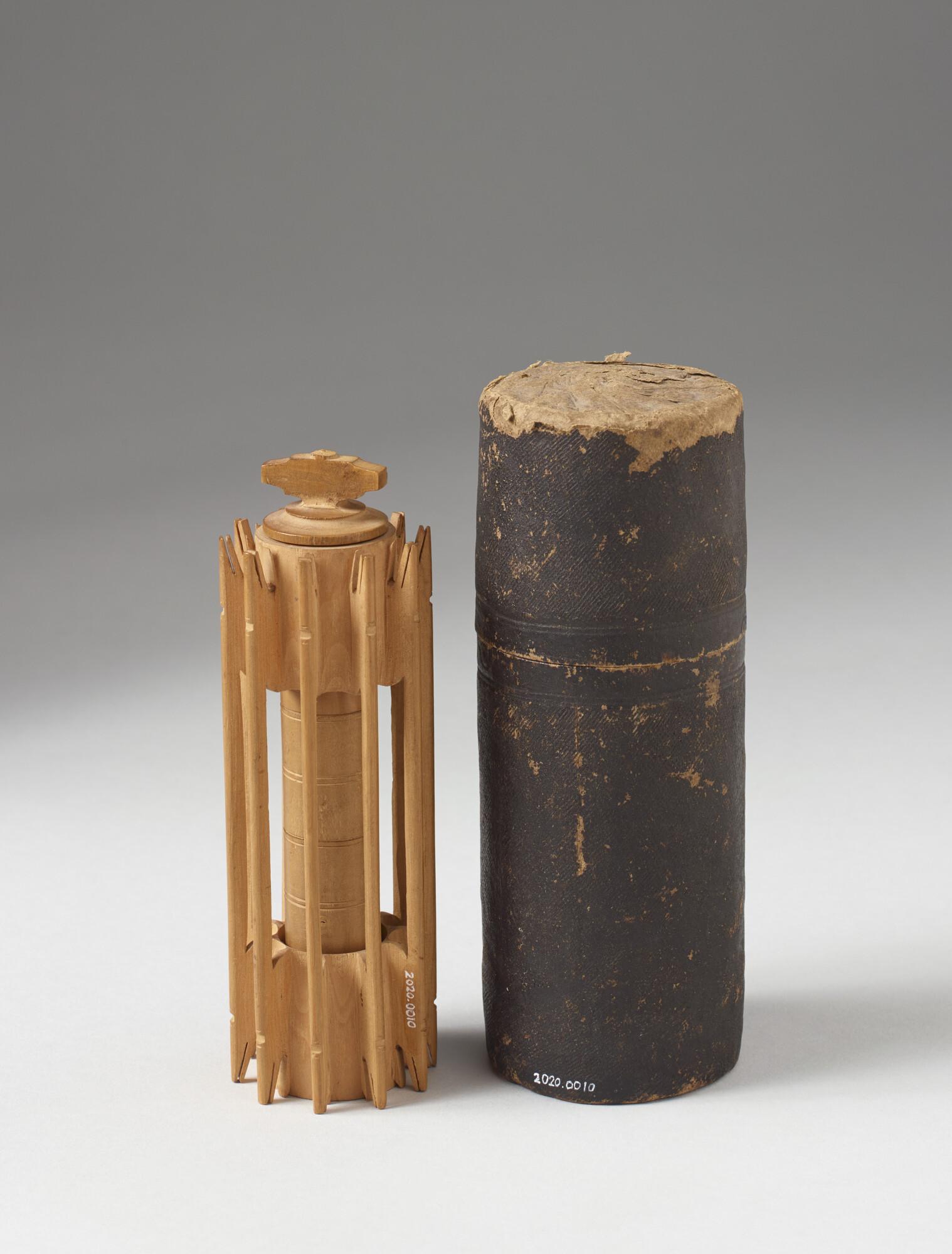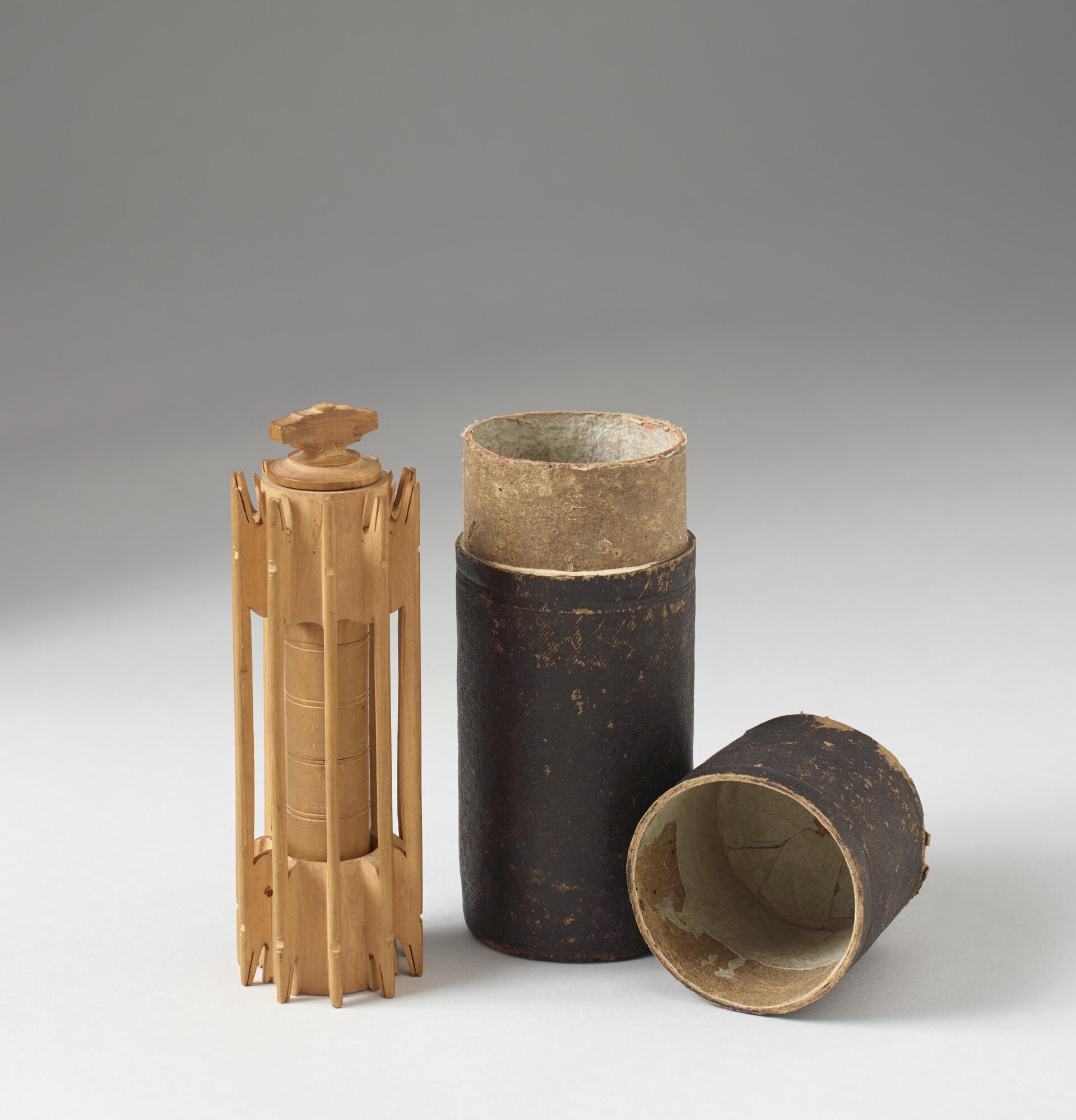 Houten naaldenkoker, prijs voor lotnummer 3789 van de trekking van de Vaderlandsche Loterij ter nagedachtenis aan de Ridder J.C.J. van Speijk. Houten naaldenkoker met vier vakjes, met in de onderste een klosje en in de derde van onder 21 loden kogeltjes. De koker wordt weer in een houten omhulsel geschroefd, met bijgeleverde kartonnen koker en ...