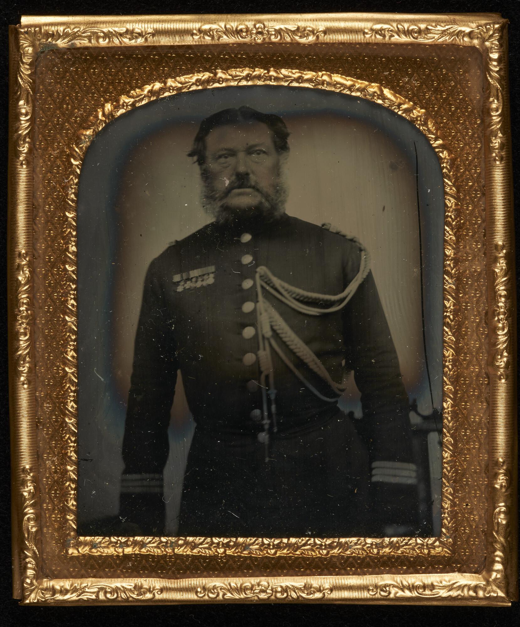 Ambrotypie; een portret van een (zee)officier in een lijstje.