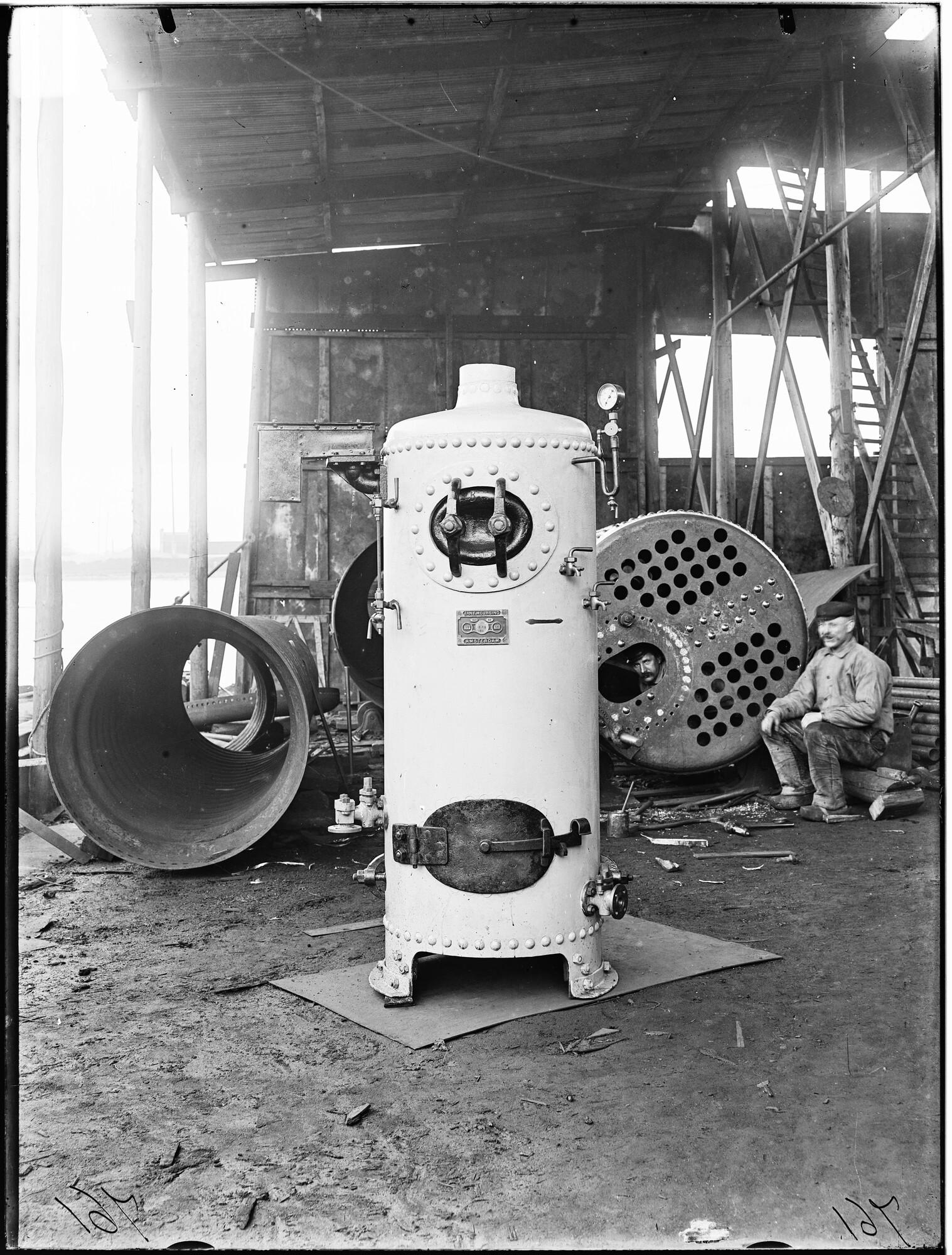 Glasnegatief van een donkeyketel (nummer 32 of 33) in aanbouw