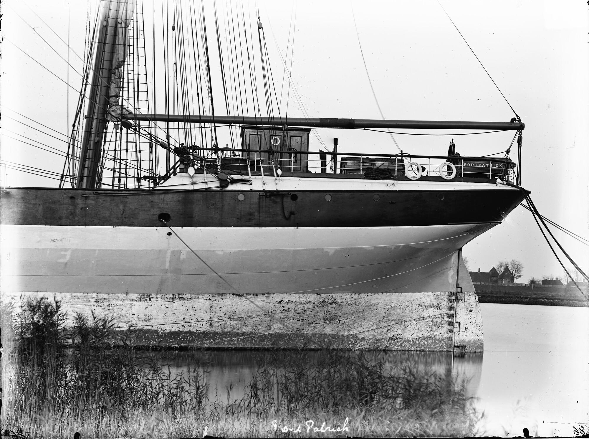 Glasnegatief van de driemast stalen bark Port Patrick afgemeerd aan een kade