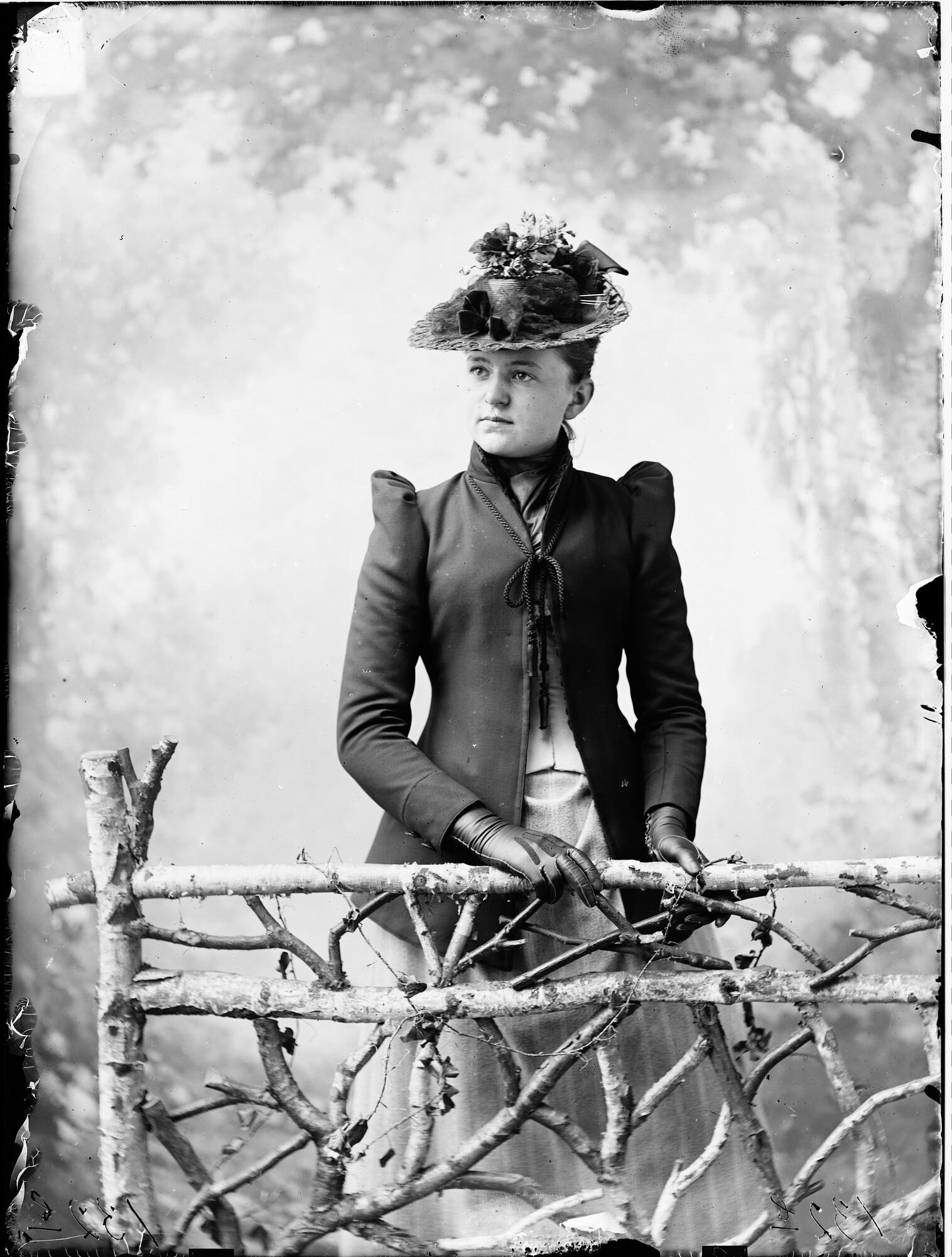 Glasnegatief met staand portret van (vermoedelijk) Mette Johanna Korthals Altes (1871 - 1899), de jongste dochter van Jan Philip en Maria ter Haar, juni 1891.