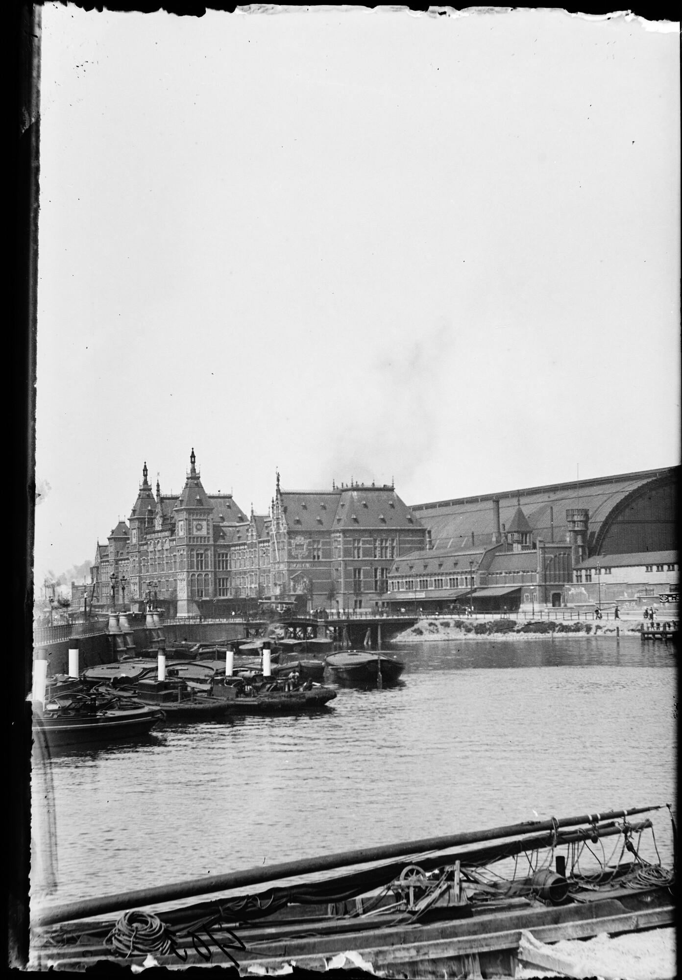 Glasnegatief van het Centraal Station te Amsterdam, zijaanzicht