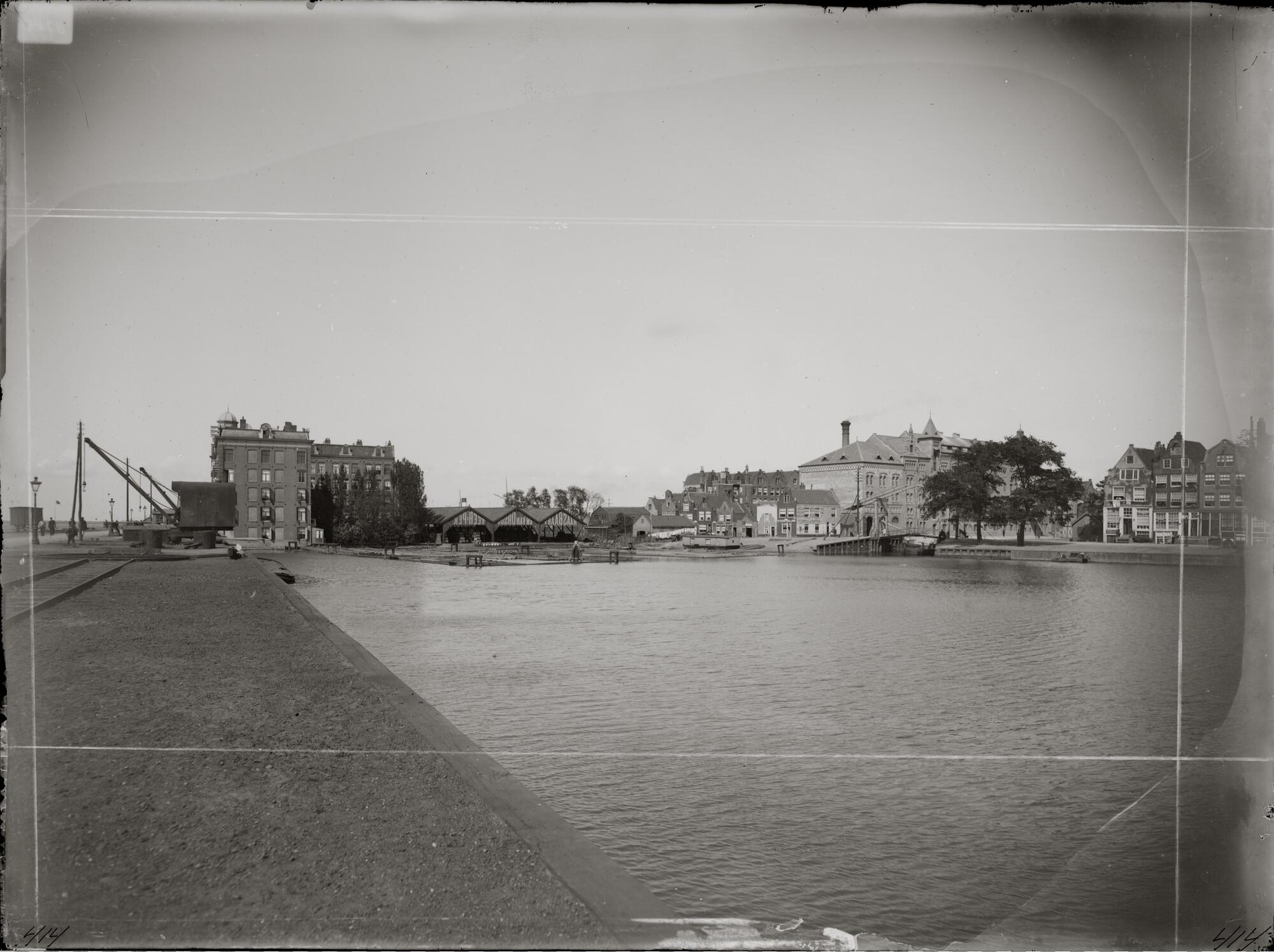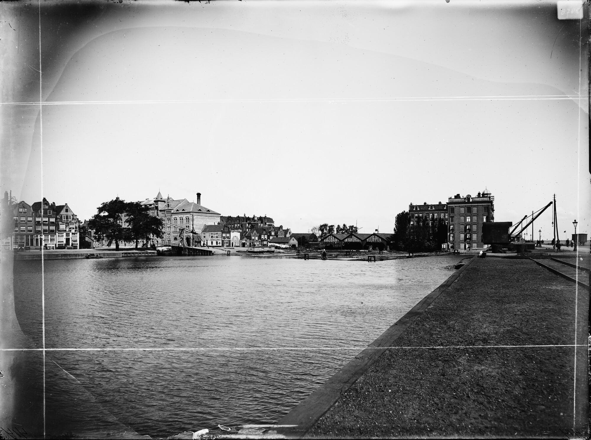 Glasnegatief van gezicht op Haasbaart & Van Orsoy teer- en pekbedrijf aan de Nieuwe Teertuinen.
