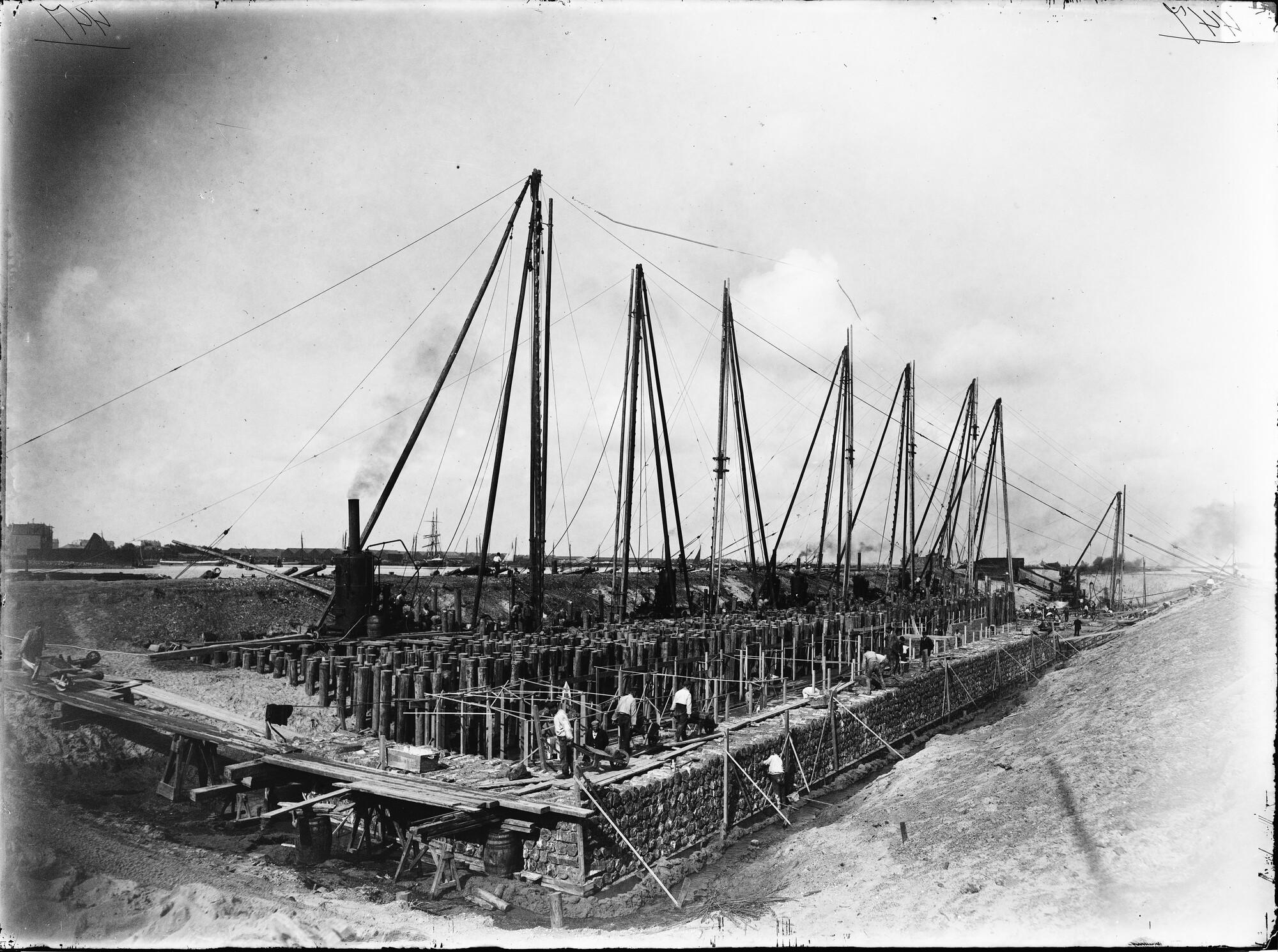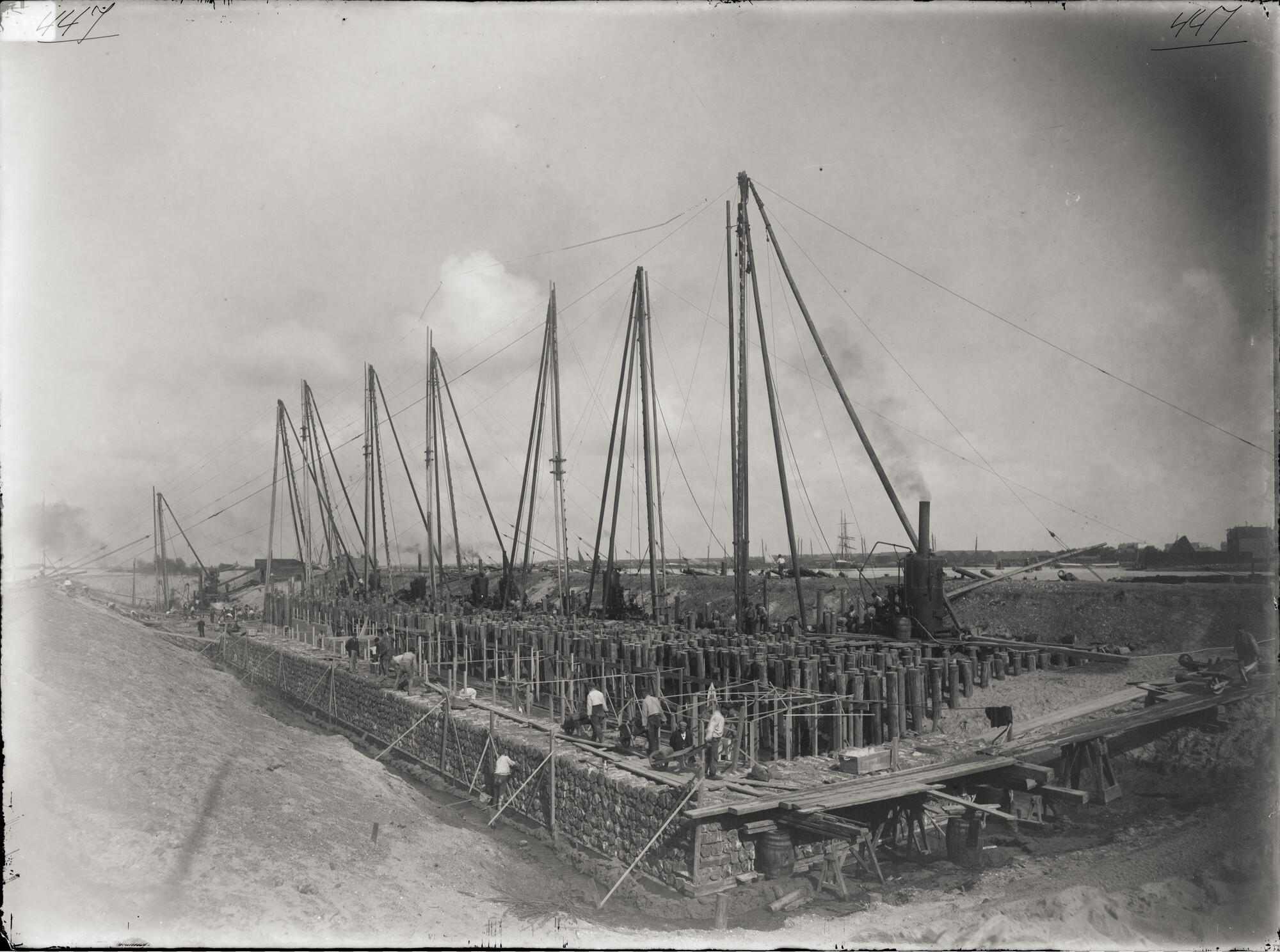 Glasnegatief van de bouw van de graansilo aan de Westerdoksdijk te Amsterdam, fundering