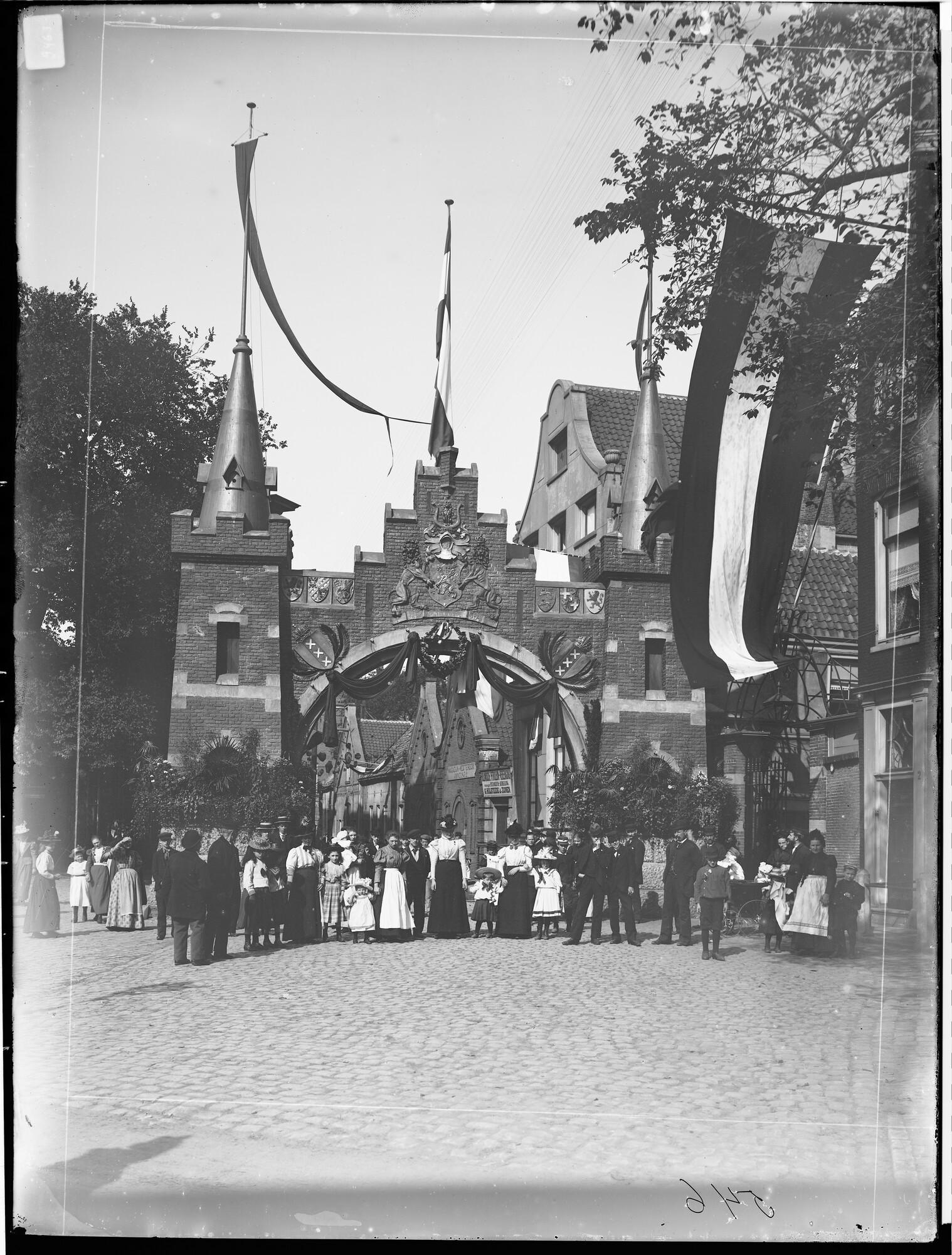 Glasnegatief van de inhuldigingsfeesten van koningin Wilhelmina te Amsterdam. Groepsportret voor een versierde toegangspoort.