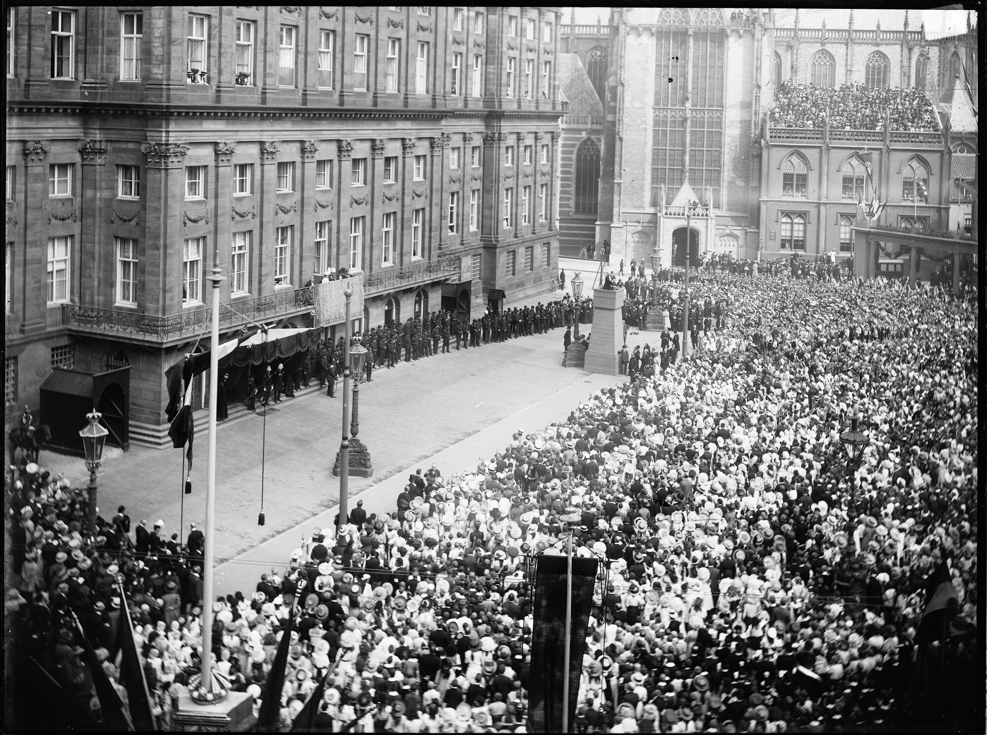 Paleis op de Dam tijdens de inhuldigingsfeesten van koningin Wilhelmina te Amsterdam. De knoningin staat op het balkon, op de Dam staat een grote mensenmassa.