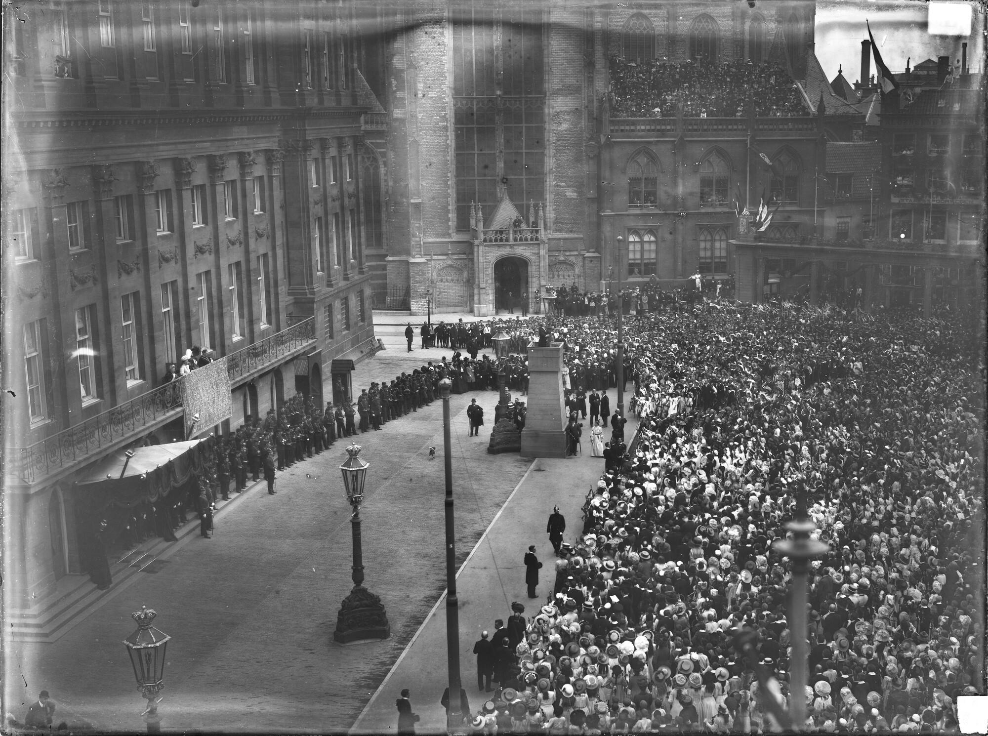 Paleis op de Dam tijdens de inhuldigingsfeesten van koningin Wilhelmina te Amsterdam.