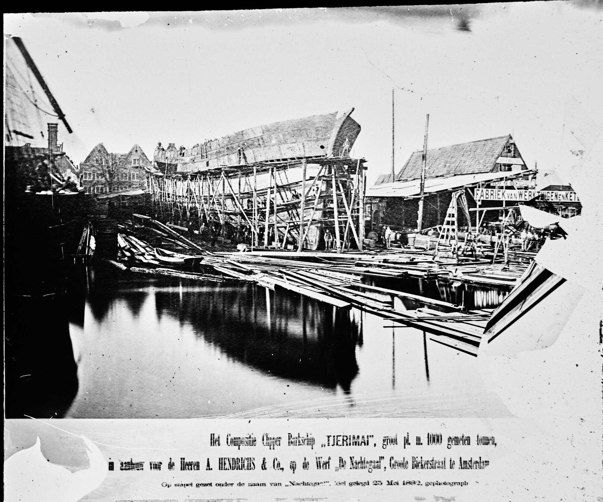 Lantaarnplaatje van zicht op de werf De Nachtegaal met de composiet bark Tjerimai in aanbouw voor de heren A. Hendrichs & Co., 1882.