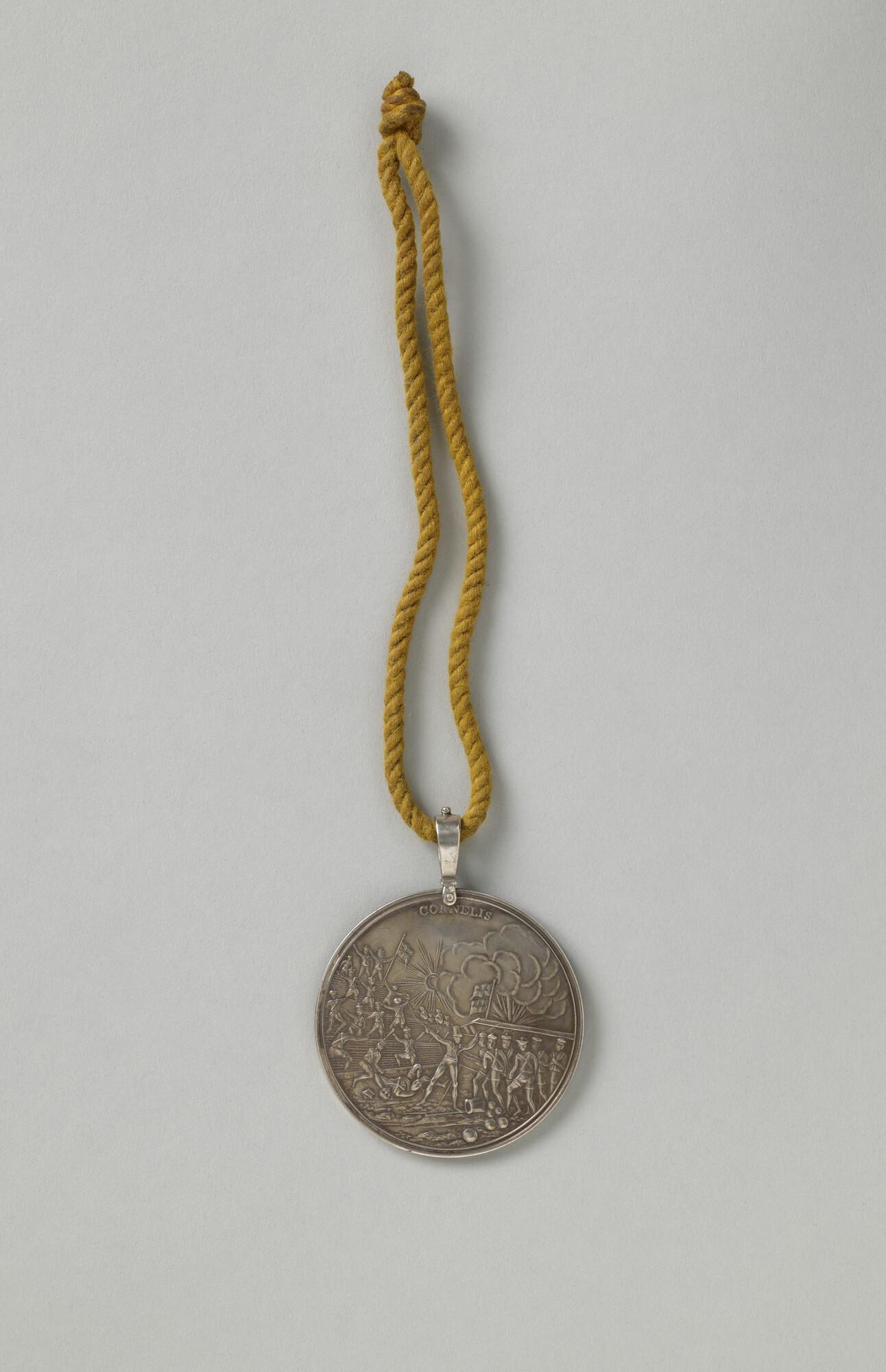 Zilveren penning geslagen op de verovering van Fort Cornelis op Java door Britse troepen. Deze penning werd door de Britse East India Company uitgekeerd aan het Indische personeel, de sepoys. Op de voorzijde is waarschijnlijk de overrompeling van een van de Nederlandse redoutes te zien. In de achtergrond wordt een andere redoute door de Nederlanders ...