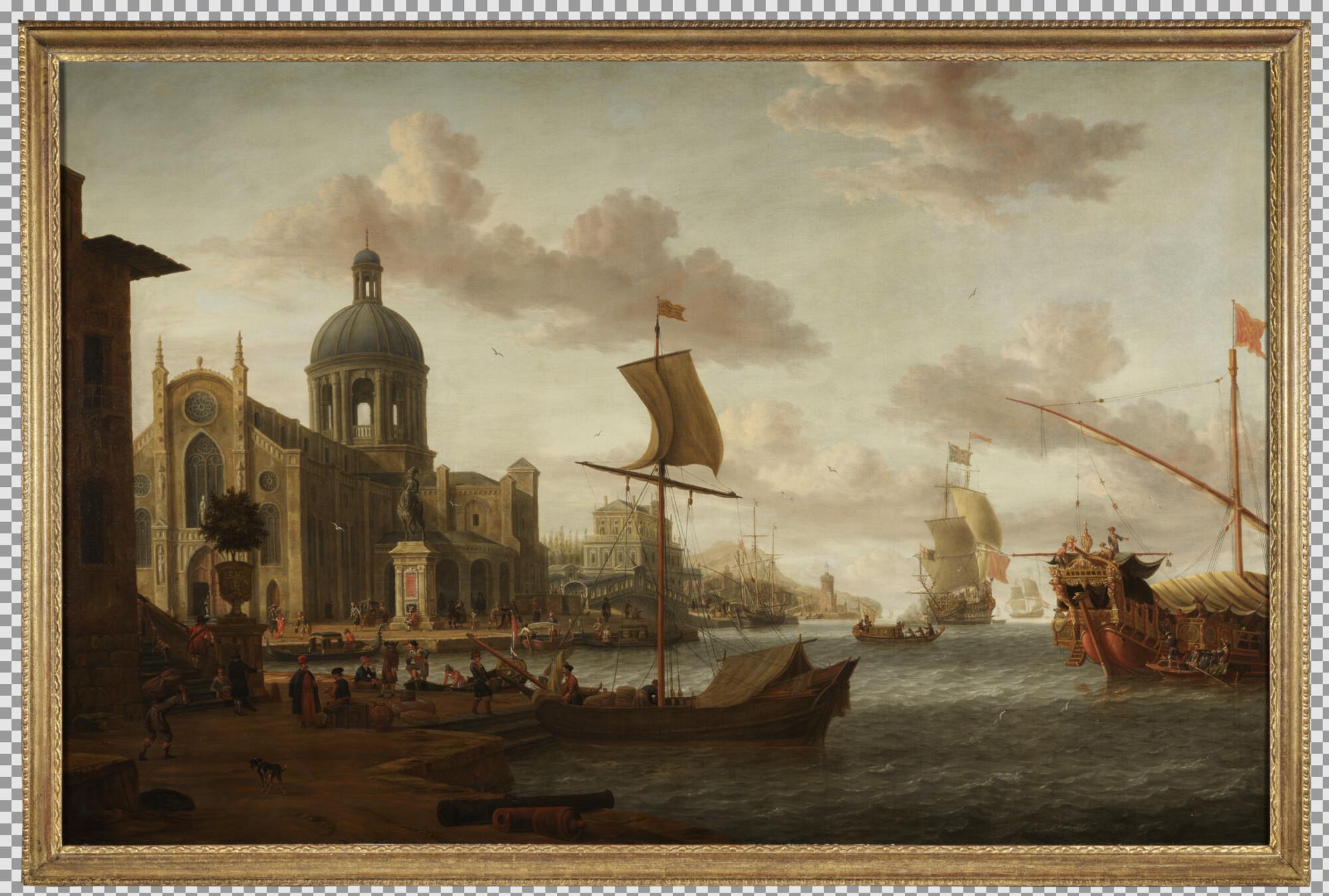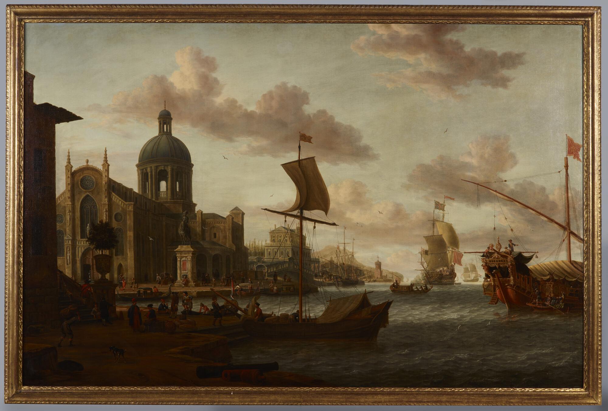 Capriccio van een Mediterrane haven. Links de San Giovanni e Paolo kerk met op het plein het ruiterstandbeeld van Bartolomeo Colleoni, een voormalig kapitein-generaal van de Republiek Venetië. Verderop bevindt zich de Rialtobrug.