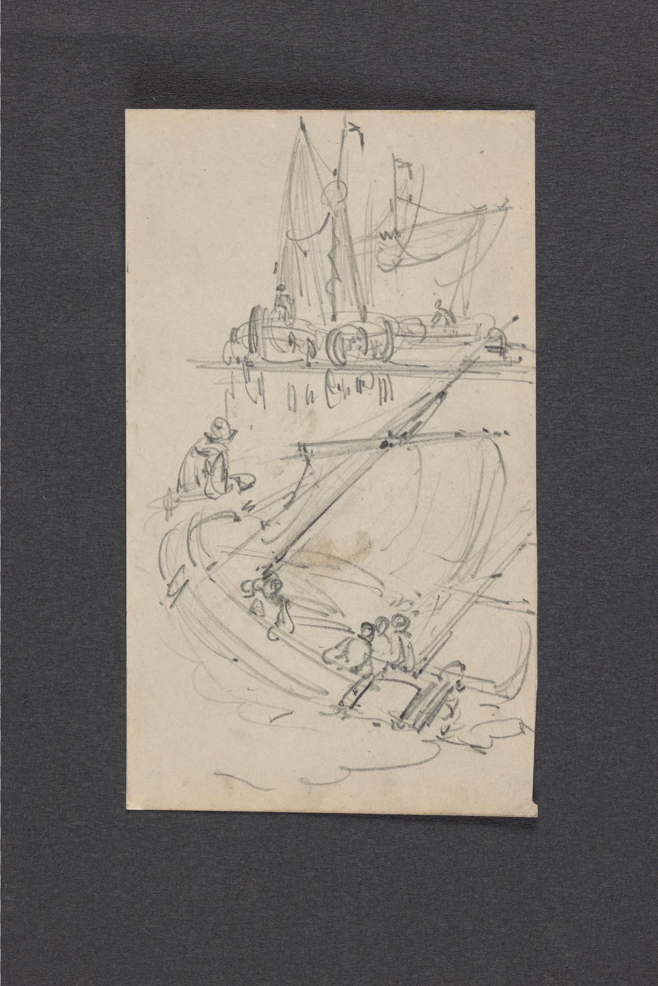 Tekening in potlood, een studie van binnenvaartschepen, een sloep en een man.
