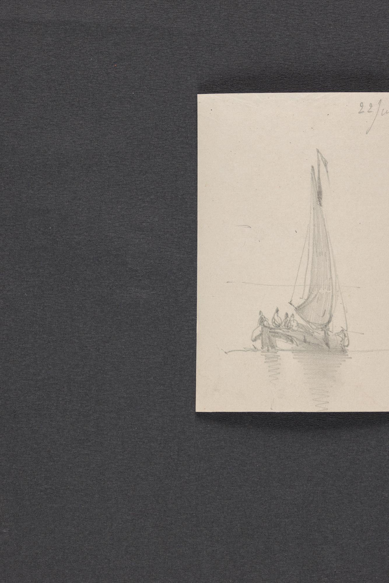 Tekening in potlood van een zeilende tjalk bij rustig weer, 22 juli 1876.