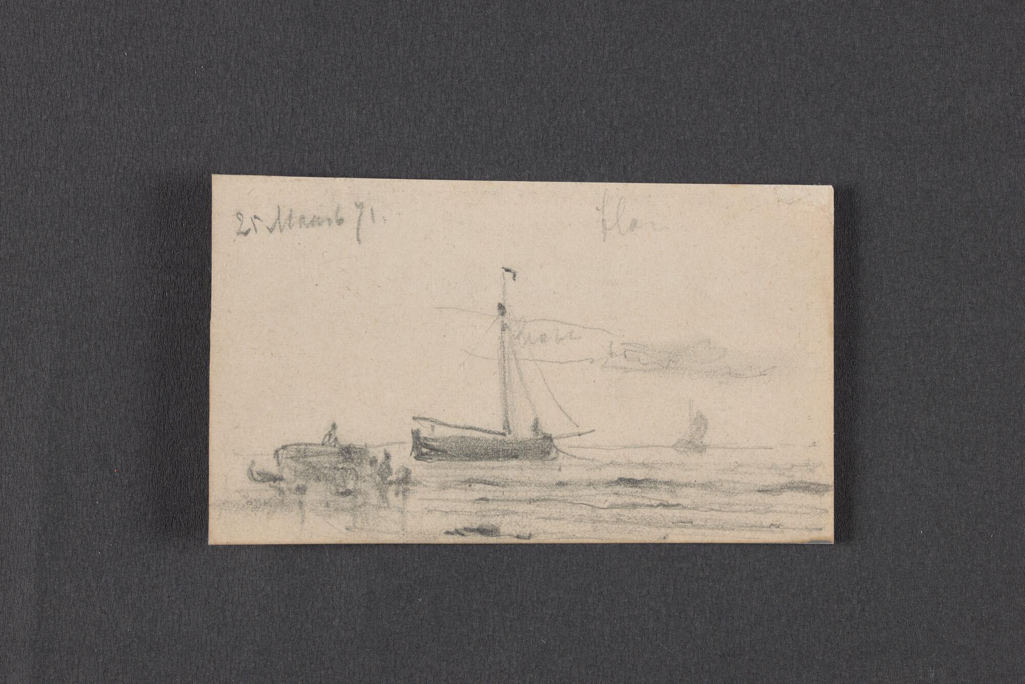 Tekening in potlood van een geankerd binnenvaartschip en een volgeladen kar, 25 maart 1871.