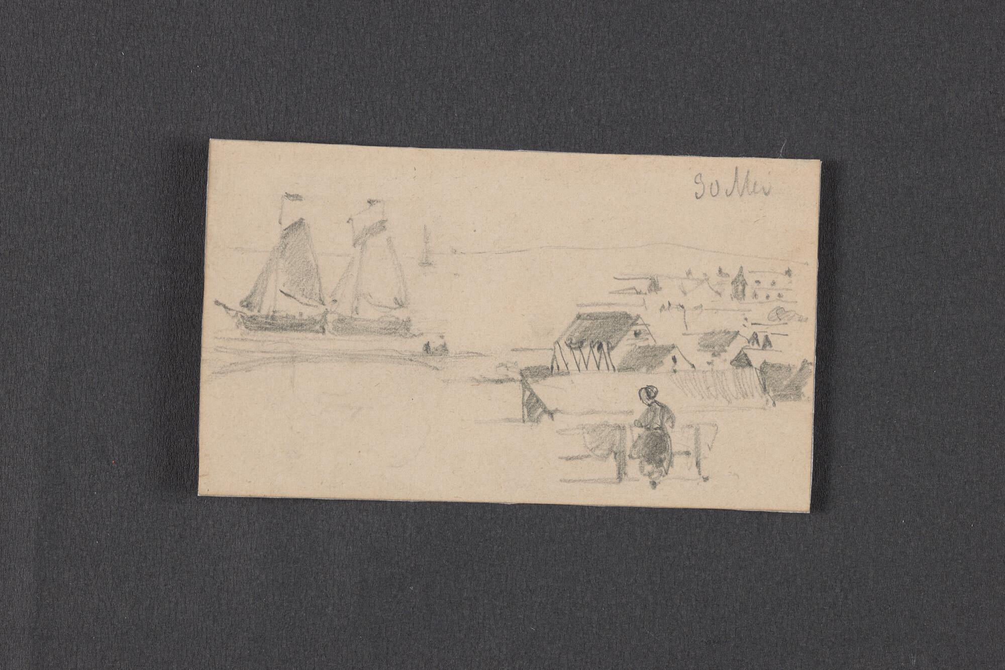 Tekening in potlood van twee schepen in zee bij de kust, 30 mei.