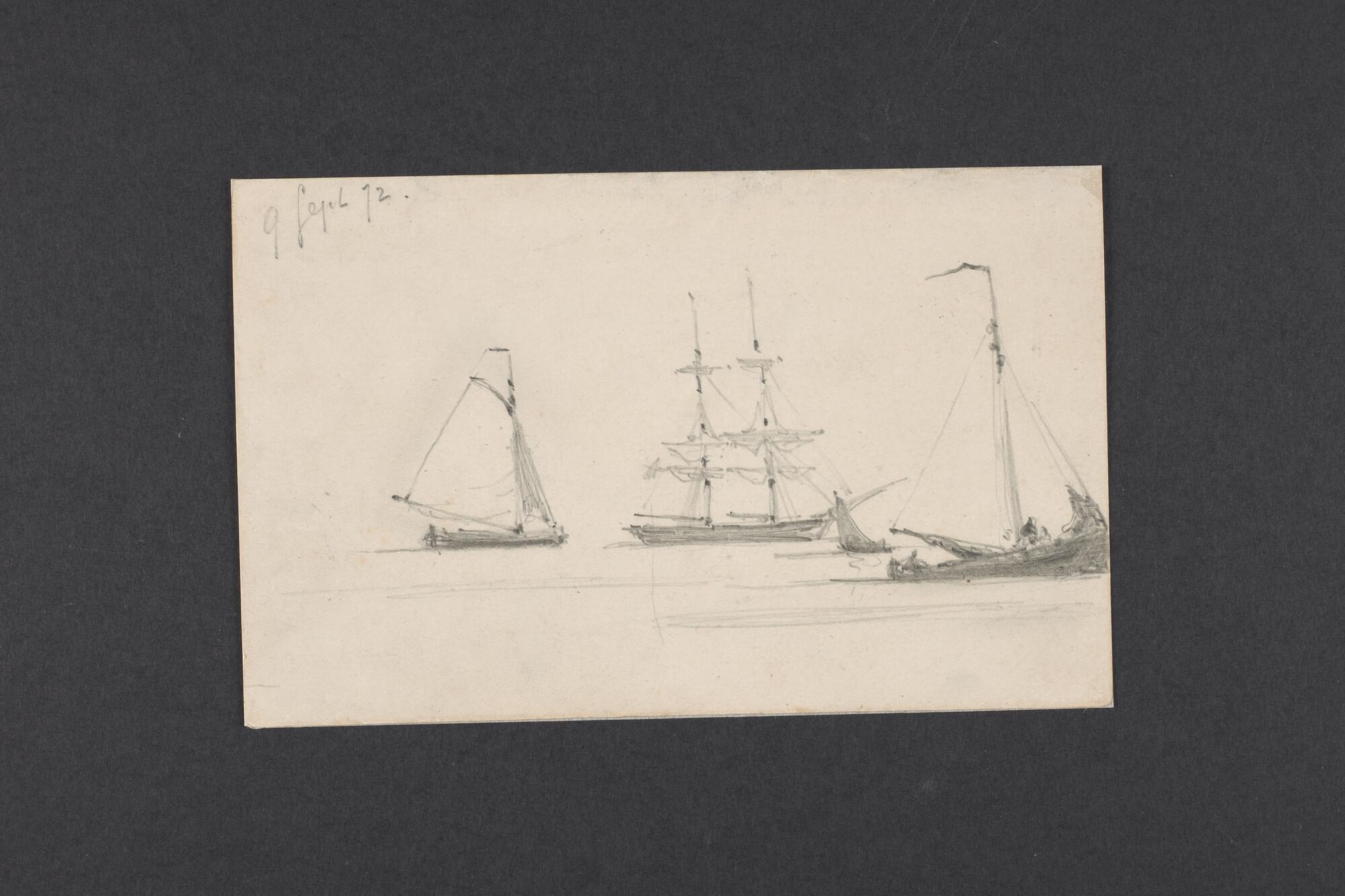 Tekening in potlood van een zeilende tjalk, een geankerde brik en een botter, 9 september 1872.