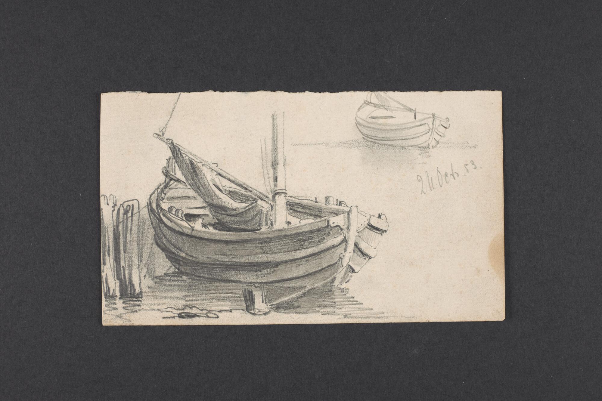 Tekening in potlood, studie van een afgemeerde kubboot, 24 oktober 1853.