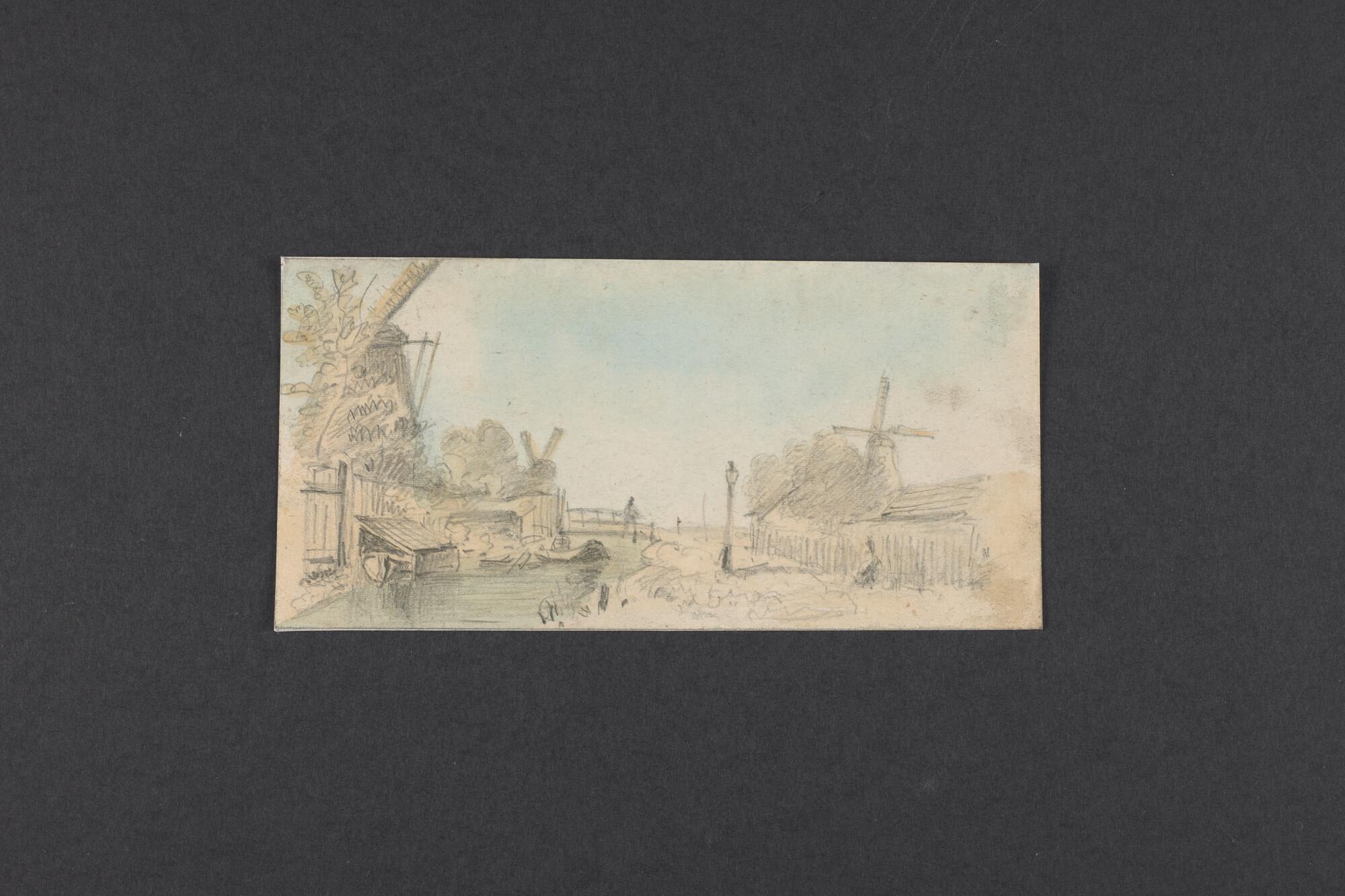 Potlood en aquarel van gezicht op vaart met molens, het Kuiperse pad.