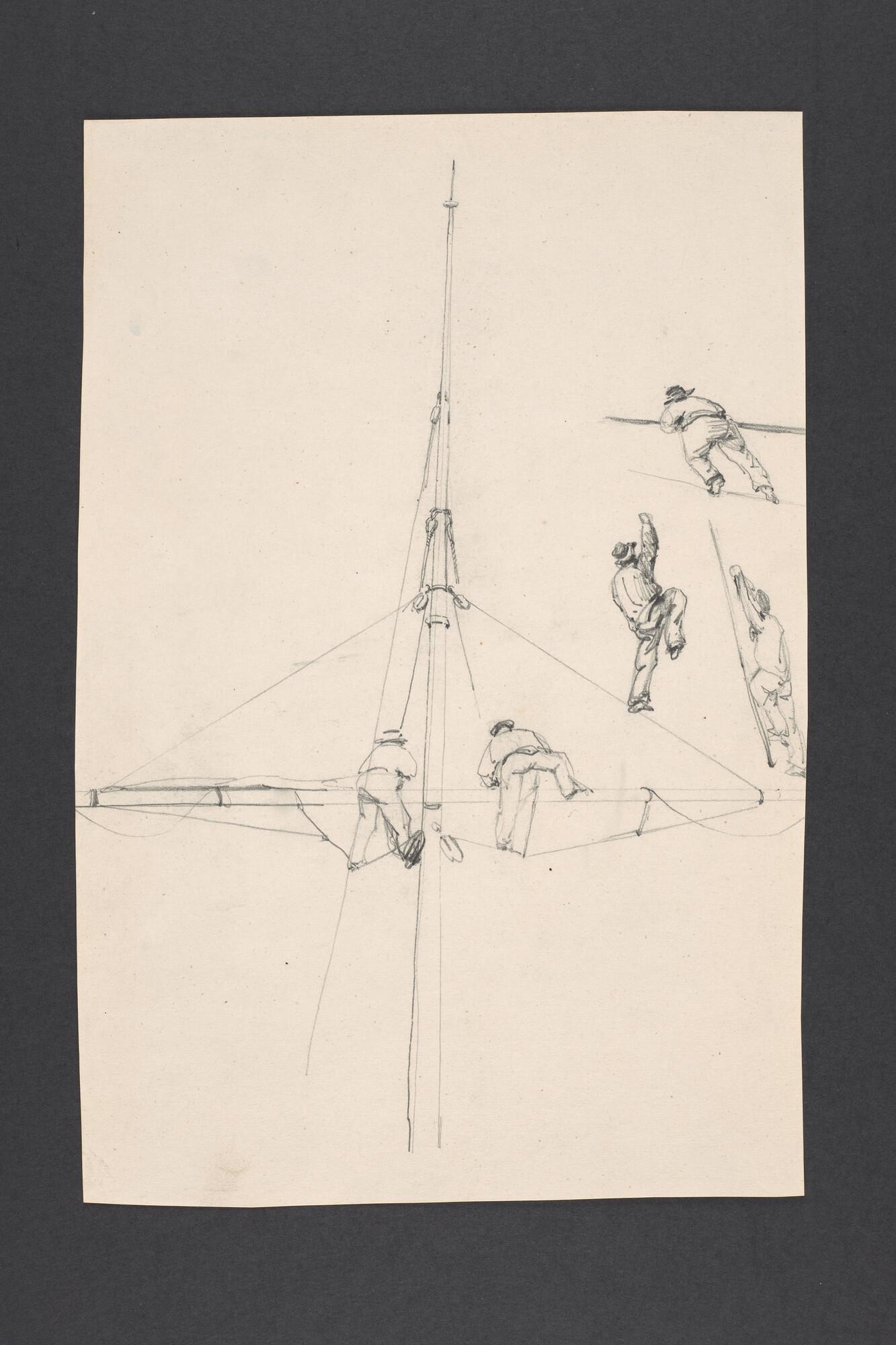 Tekening in potlood van klimmende- en staande zeelieden op een ra.