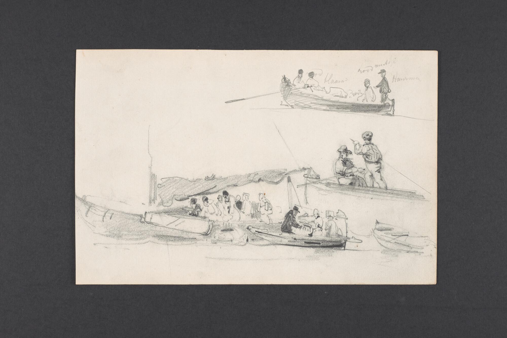 Tekening in potlood van mensen in een botter met roeiboot langszij en schetsen van andere roeiboten.