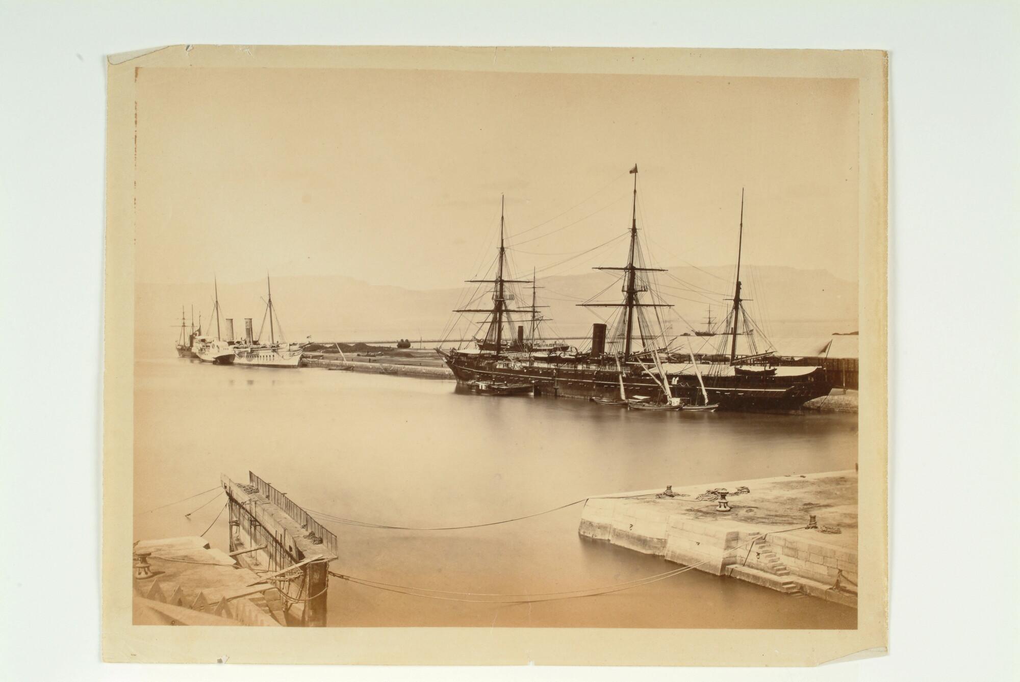 Foto van afgemeerde schepen in de haven van Suez.
