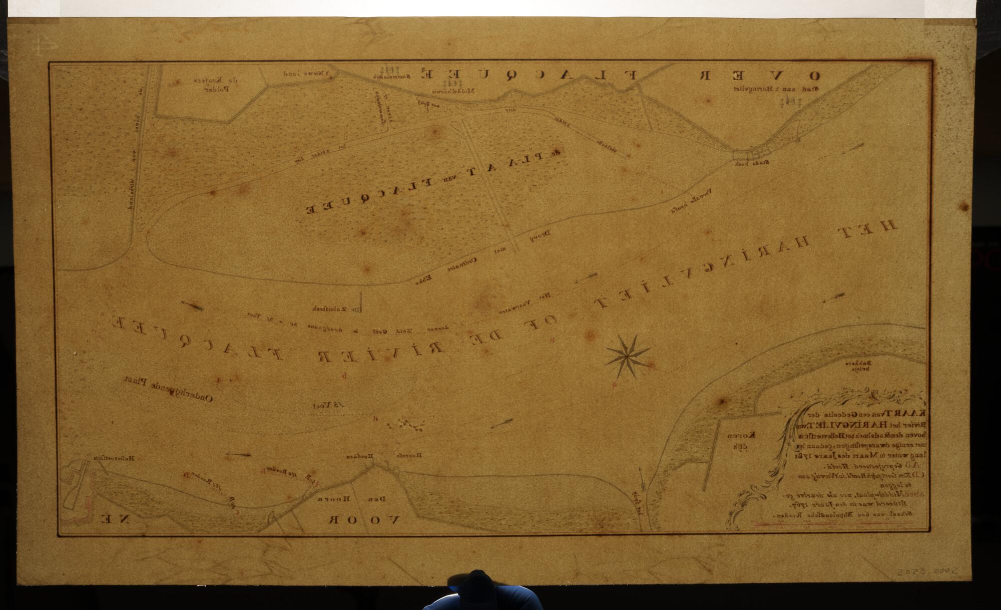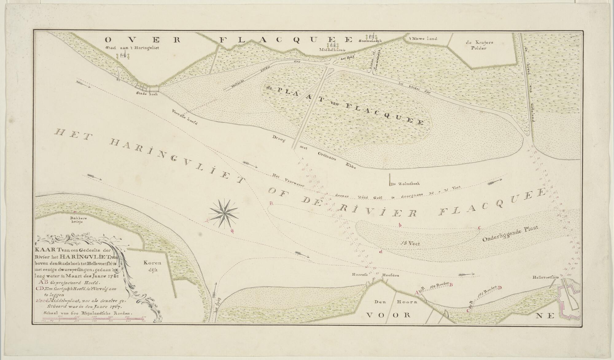 Kaart in handschrift van een gedeelte van het Haringvliet tussen Voorne en Overflakkee met dieptemetingen, met de haven Hellevoetsluis. Van deze kaart is een gedrukte versie 'Kaart van een gedeelte der rivier het Haringvliet' uit 1781 door Dirk Klinkenberg