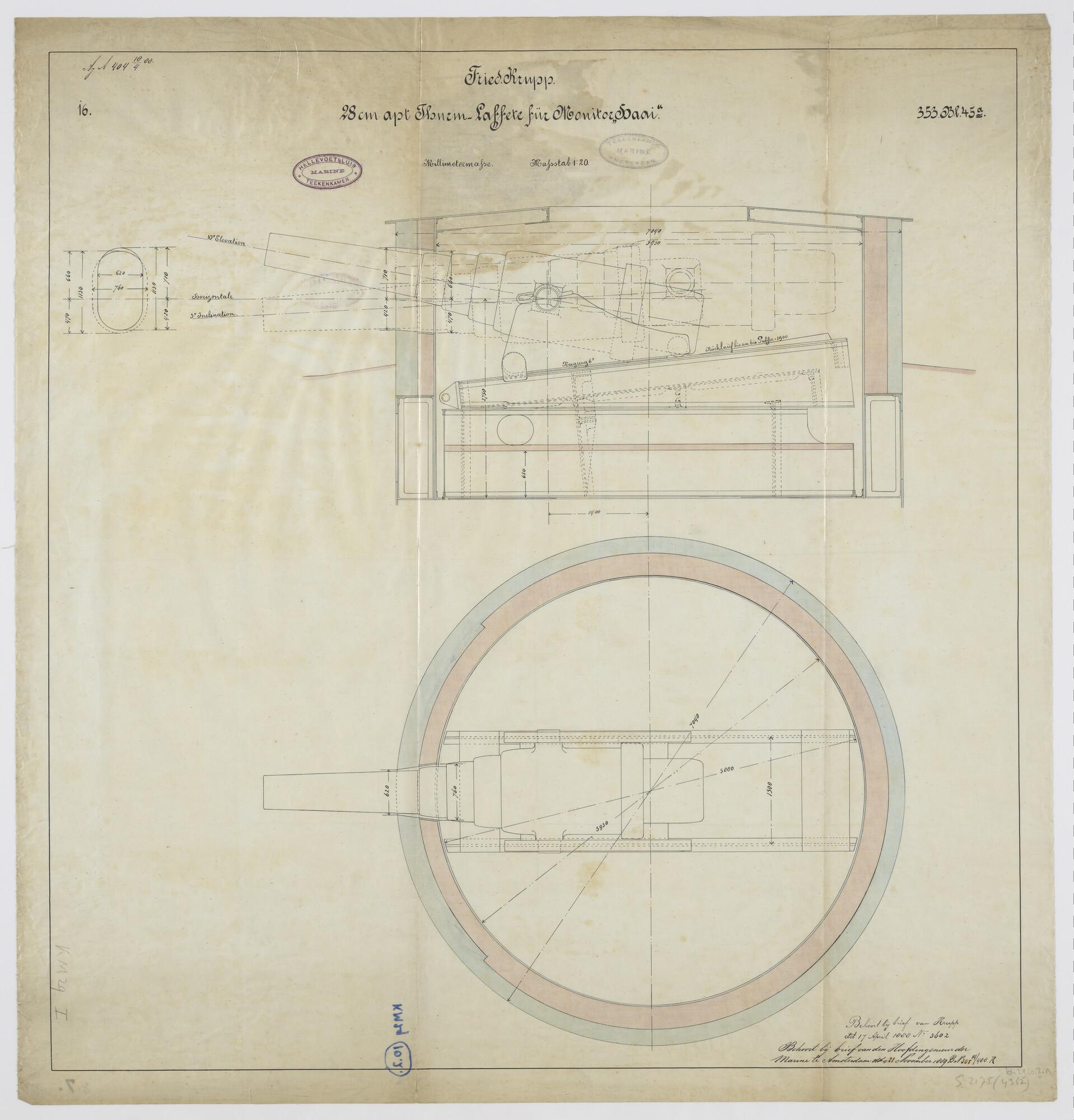 Geschuttoren met 28 cm kanon van de monitor Zr.Ms. 'Haai'. Verticale langsdoorsnede en horizontale dwarsdoorsnede van de geschuttoren voor het 28cm kanon geplaatst aan boord van de rammonitor 2de klasse Zr.Ms. 'Haai' (schaal 1:20).