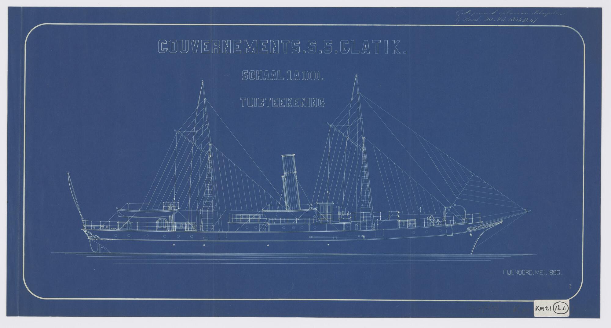 Zijaanzicht over SB-zijde boven de waterlijn met tuigplan en zeilplan van het stoomschip voor de Gouvernementsmarine Hr.Ms. "Glatik". Twee masten, boeg- en achterstevenversiering, open brug met kaartenkamer, schoorsteen, slopen, peilkompas, dekhuis (schaal 1:100).