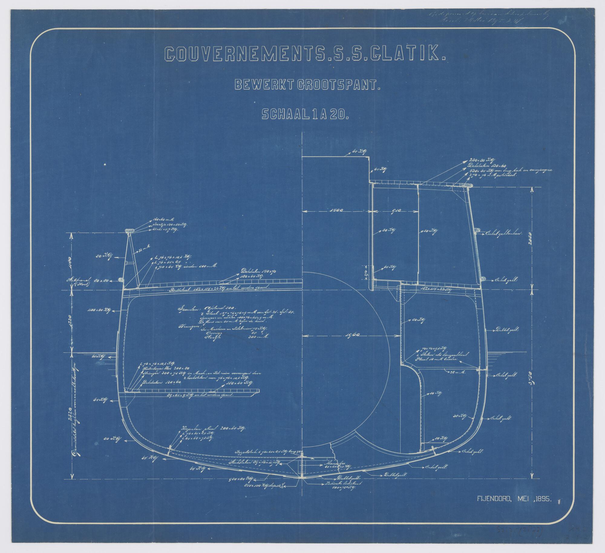 Twee halve dwarsdoorsneden over de spanten 40 (bewerkt grootspant) en 52 van het stoomschip voor de Gouvernementsmarine Hr.Ms. Glatik (schaal 1:20).