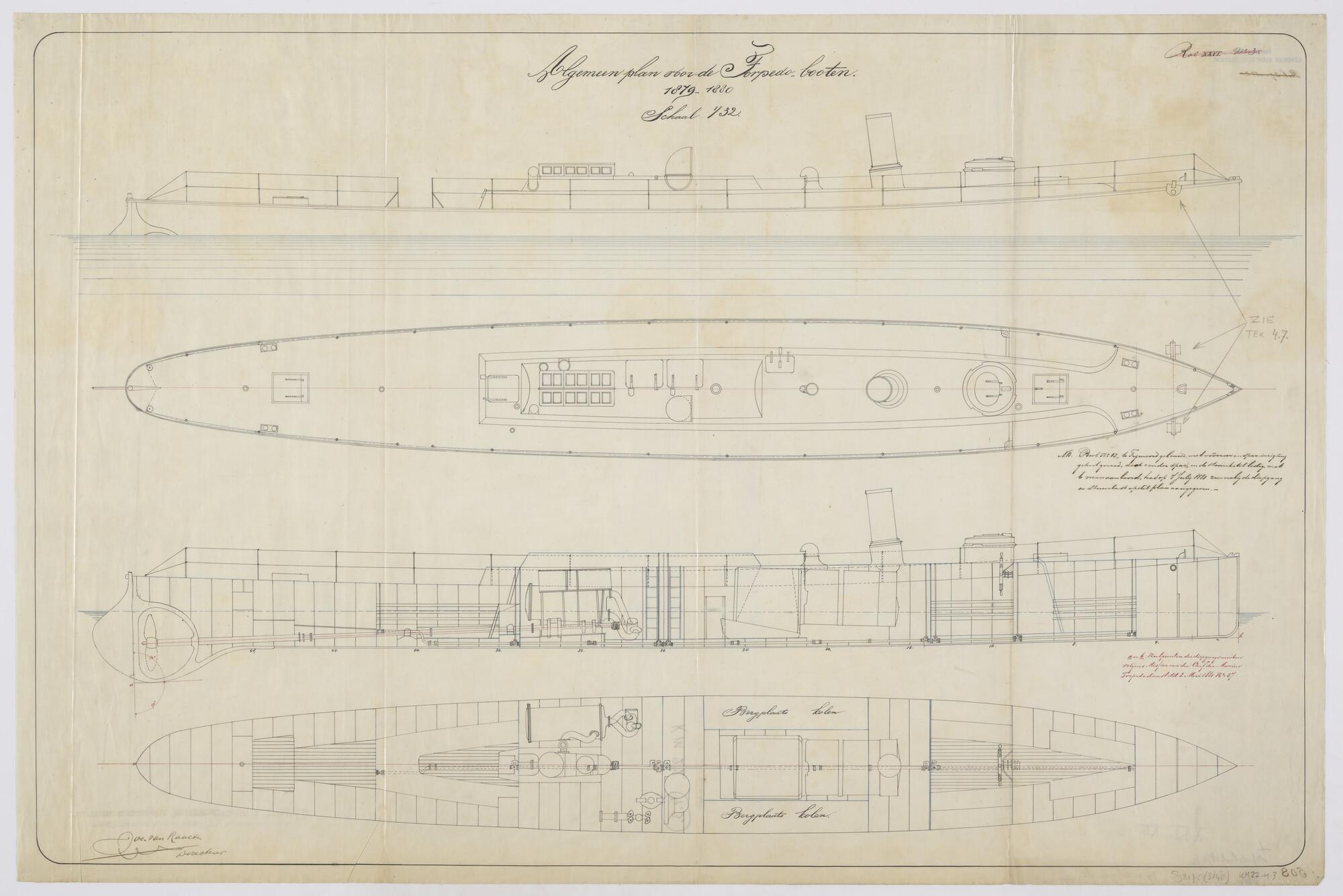 Zijaanzicht, bovenaanzicht, horizontale- en verticale langsdoorsnede van spartorpedoboot Zr.Ms. "X", "XIII", "XIV", "XV" en "XVI". Dubbele sparinrichting, stuurpositie vooruit, machinekamer, kolenhokken, schroefas met schroef, geleideblok van de torpedosparren (schaal 1:32).