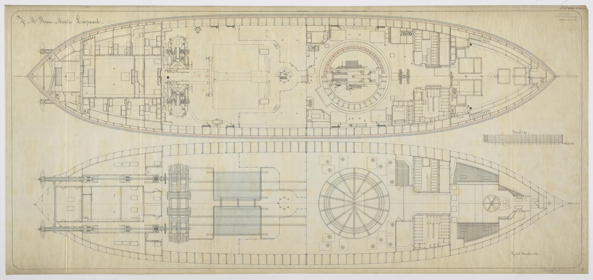 Indelingstekening van het tussendek en het ruim van de rammonitor 2de klasse Zr.Ms. Luipaard