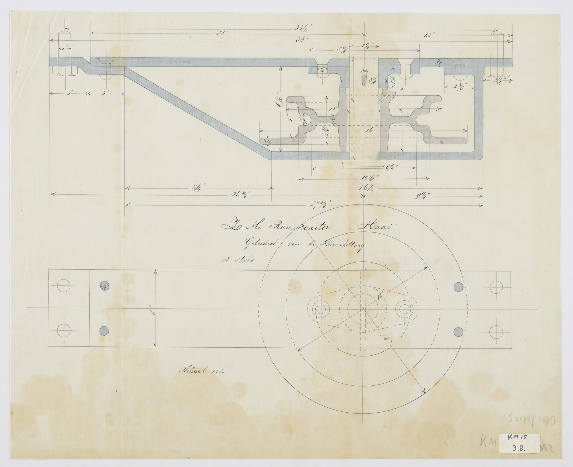 De geleidrol voor de damketting als onderdeel van het roer van de rammonitor 2de klasse Zr.Ms. Haai (schaal 1:2).