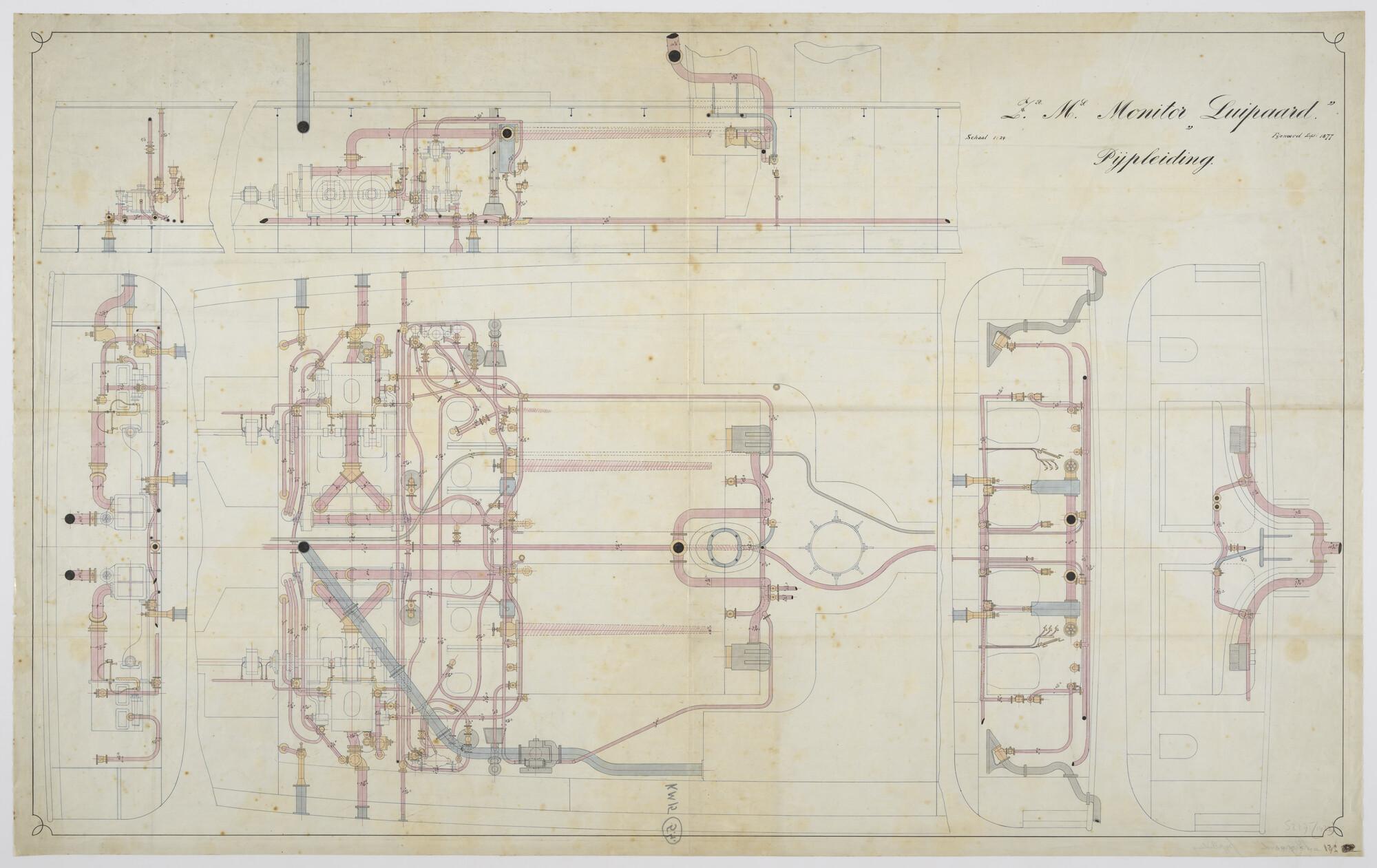 Pijpleidingen in de machinekamer en het ketelruim van de rammonitor 2de klasse Zr.Ms. Luipaard