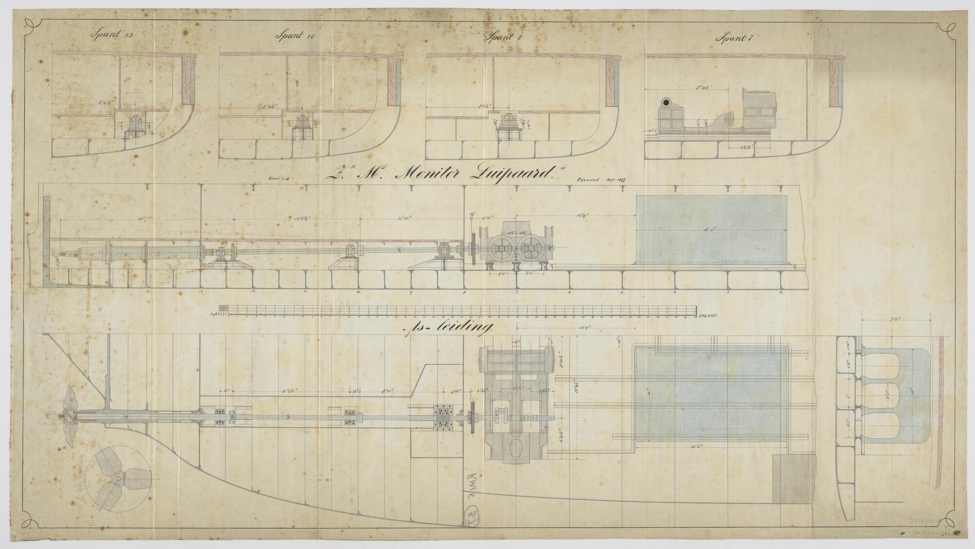 Monitor "Luipaard": asleiding. Verticale langsdoorsnede, horizontale dwarsdoorsnede en dwarsdoorsneden van de rammonitor 2de klasse Zr.Ms. "Luipaard" over de spanten 7, 8 en 10 met betrekking tot de SB-asleiding. Schroef, schroefas, tandwielkast (schaal 1:24).